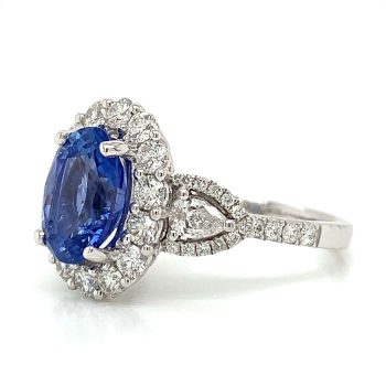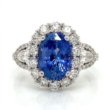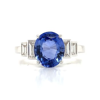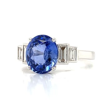 A beautiful royal blue cushion cut Sapphire between bright brilliant cut Diamonds claw set in an attractive platinum setting with a strong ring shank. This ring is a one-off piece.Metal: 950 PlatinumSapphire Weight: 2.42 Carat (Certificated Stone)Sapphire Dimensions: 7.85 x 6.51 x 5.33mmTotal Diamond Weight: 0.50 CaratFinger Size: MGift Boxed
