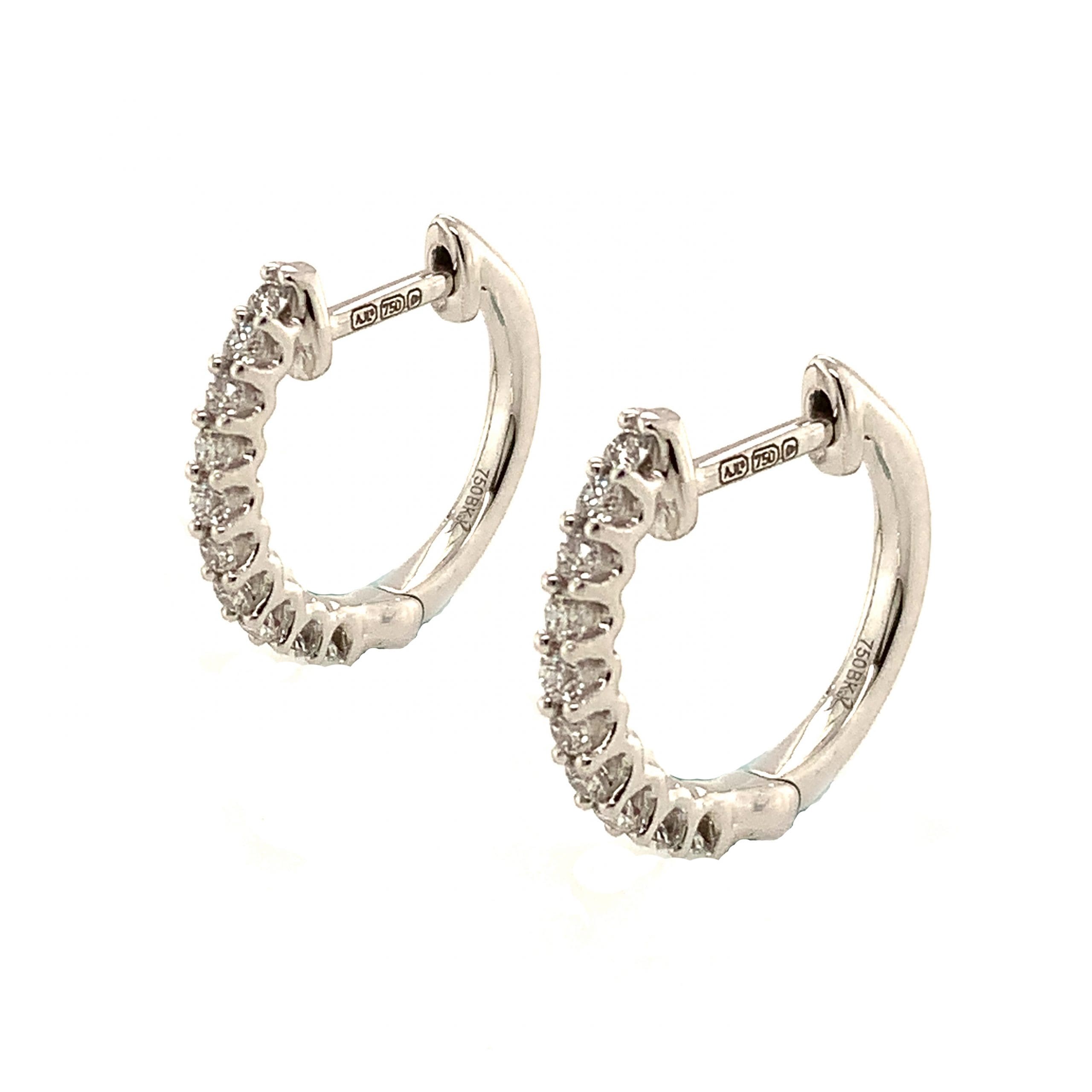 Elegant Diamond huggie earrings, half set with a sparkling wall of round brilliant cut Diamonds of good colour and clarity.  With a hinged base for opening.