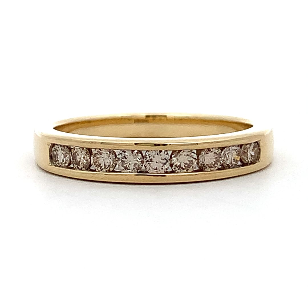 A pretty yellow gold eternity ring channel set with round brilliant cut diamonds.