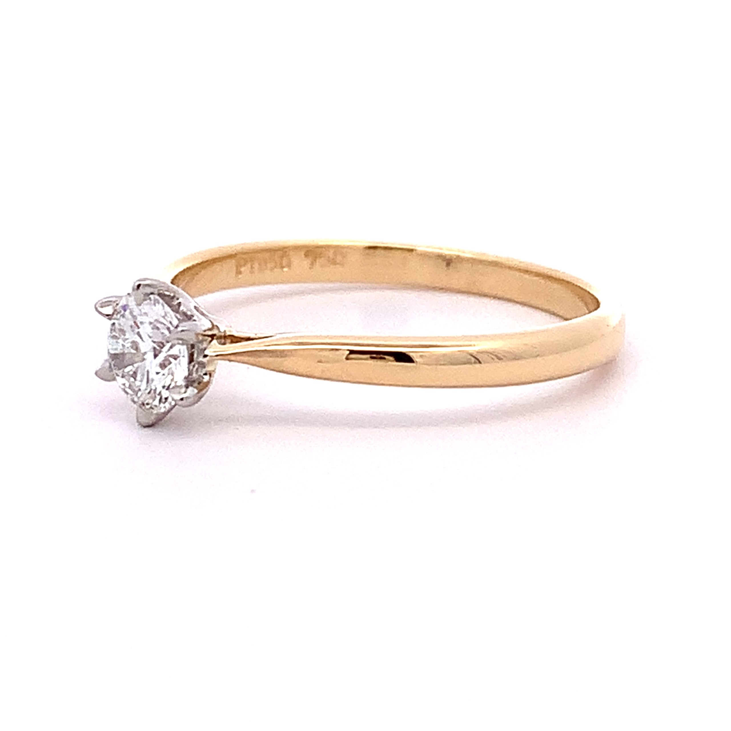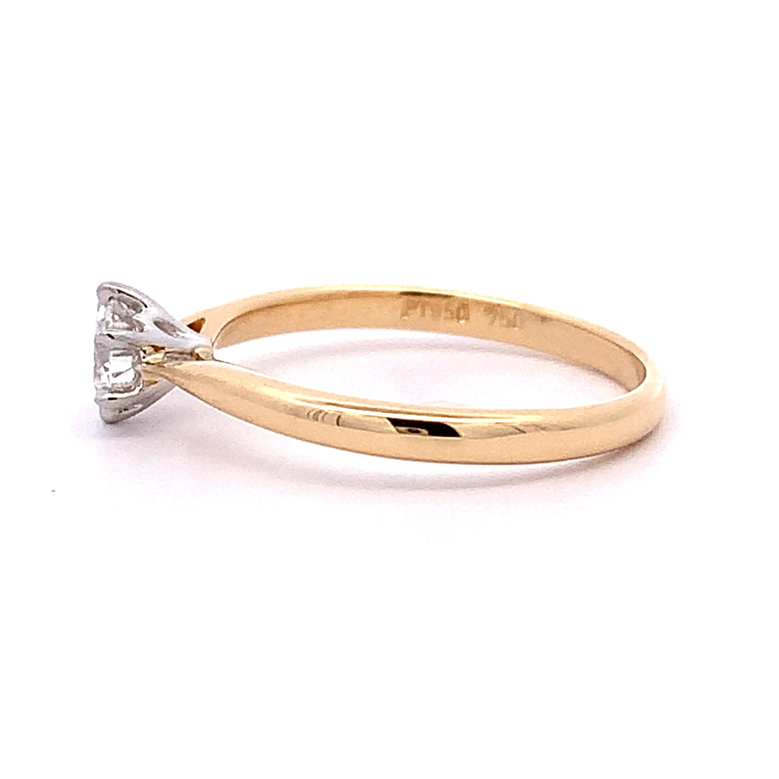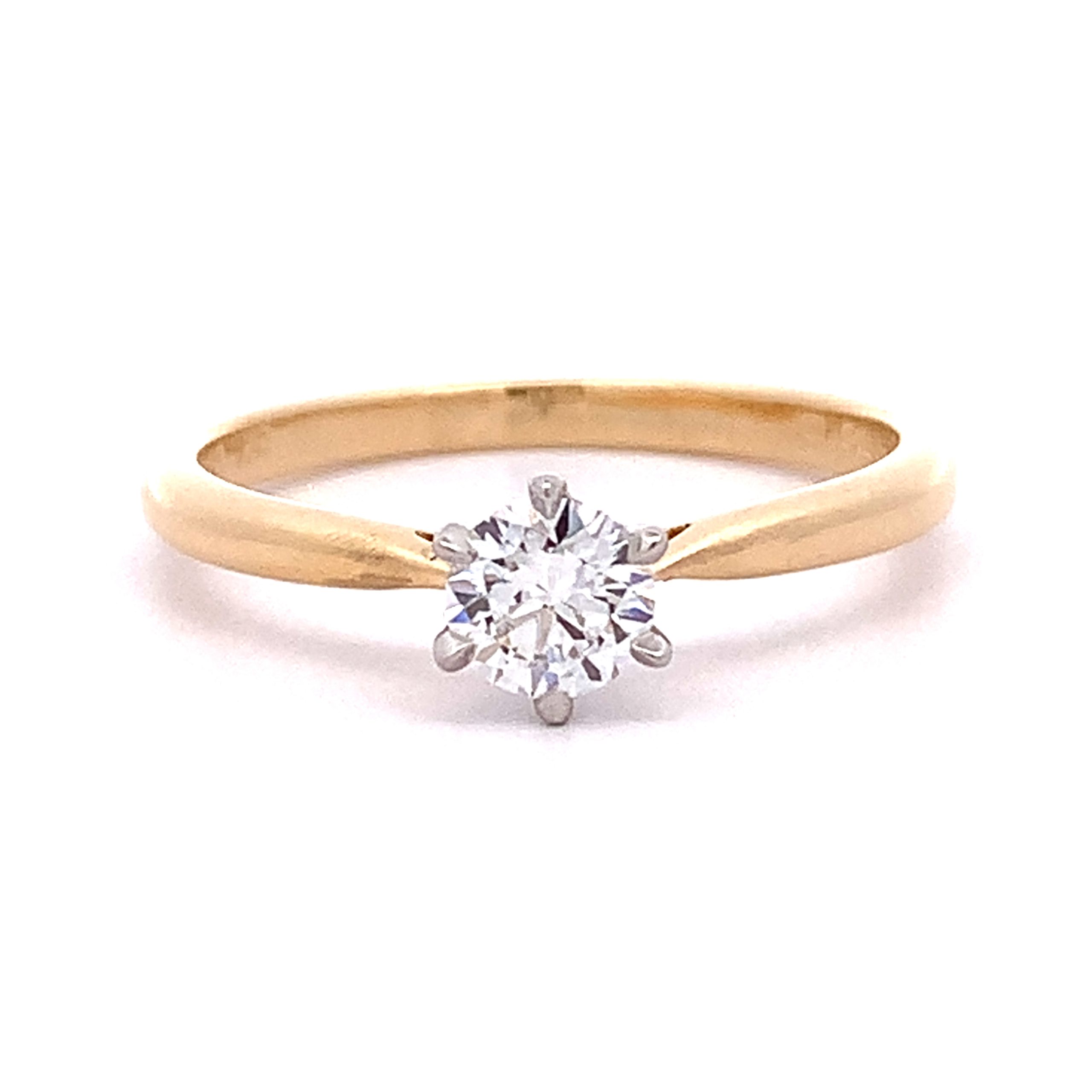 An elegant engagement ring with a G.I.A certificated round brilliant cut diamond in a white gold six claw setting upon a yellow gold ring shank.