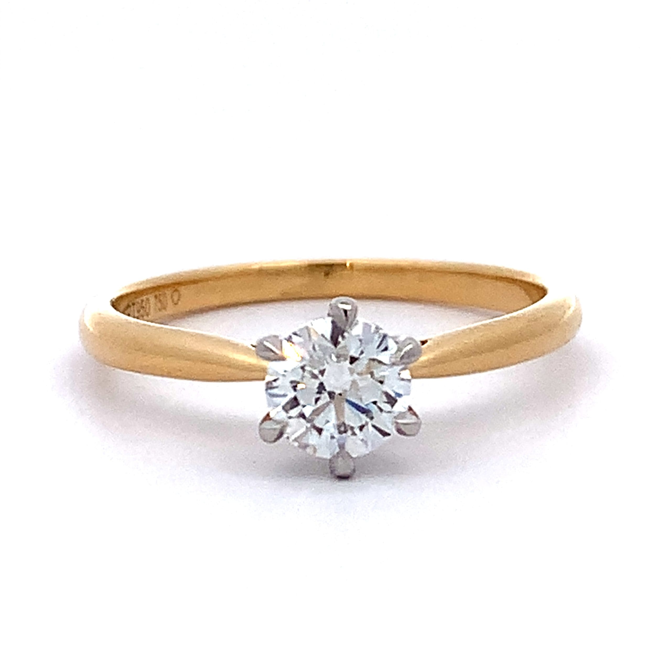An elegant ladies diamond solitaire in 18 carat yellow gold. This is a G.I.A certificated round cut diamond set in a six claw platinum setting.