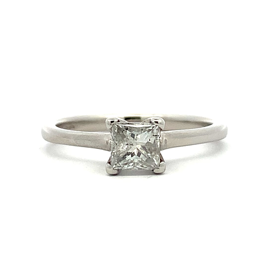 A modern four claw platinum ring set with a half carat princess cut diamond.