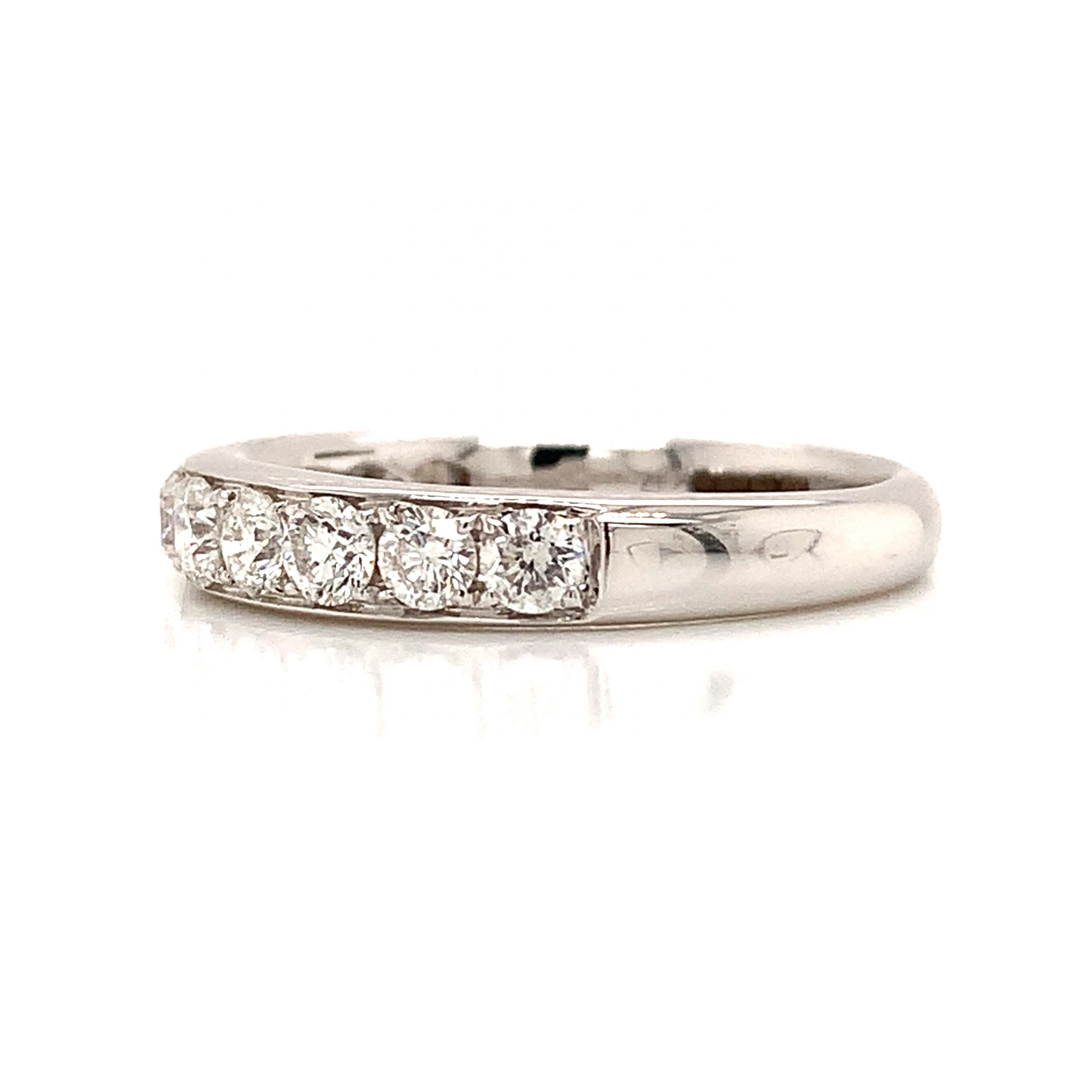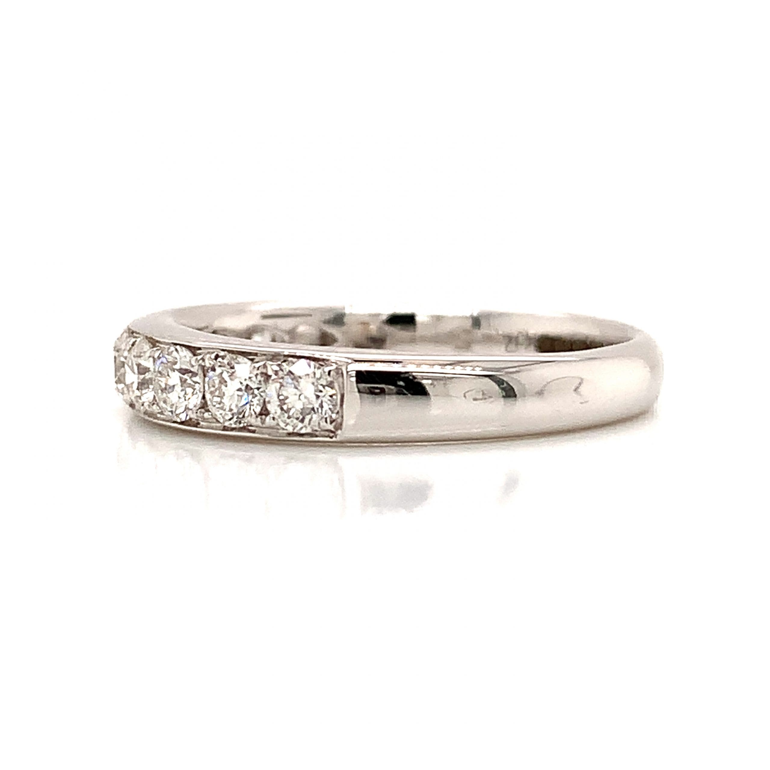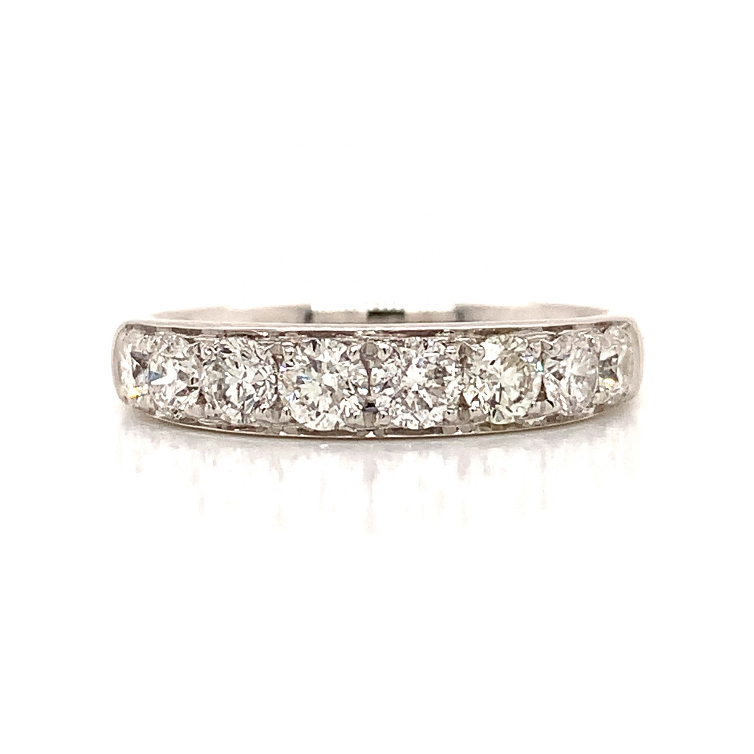 A gorgeous eternity ring comprising a row of nine brilliant cut diamonds, grain set in a smooth rounded white gold ring.