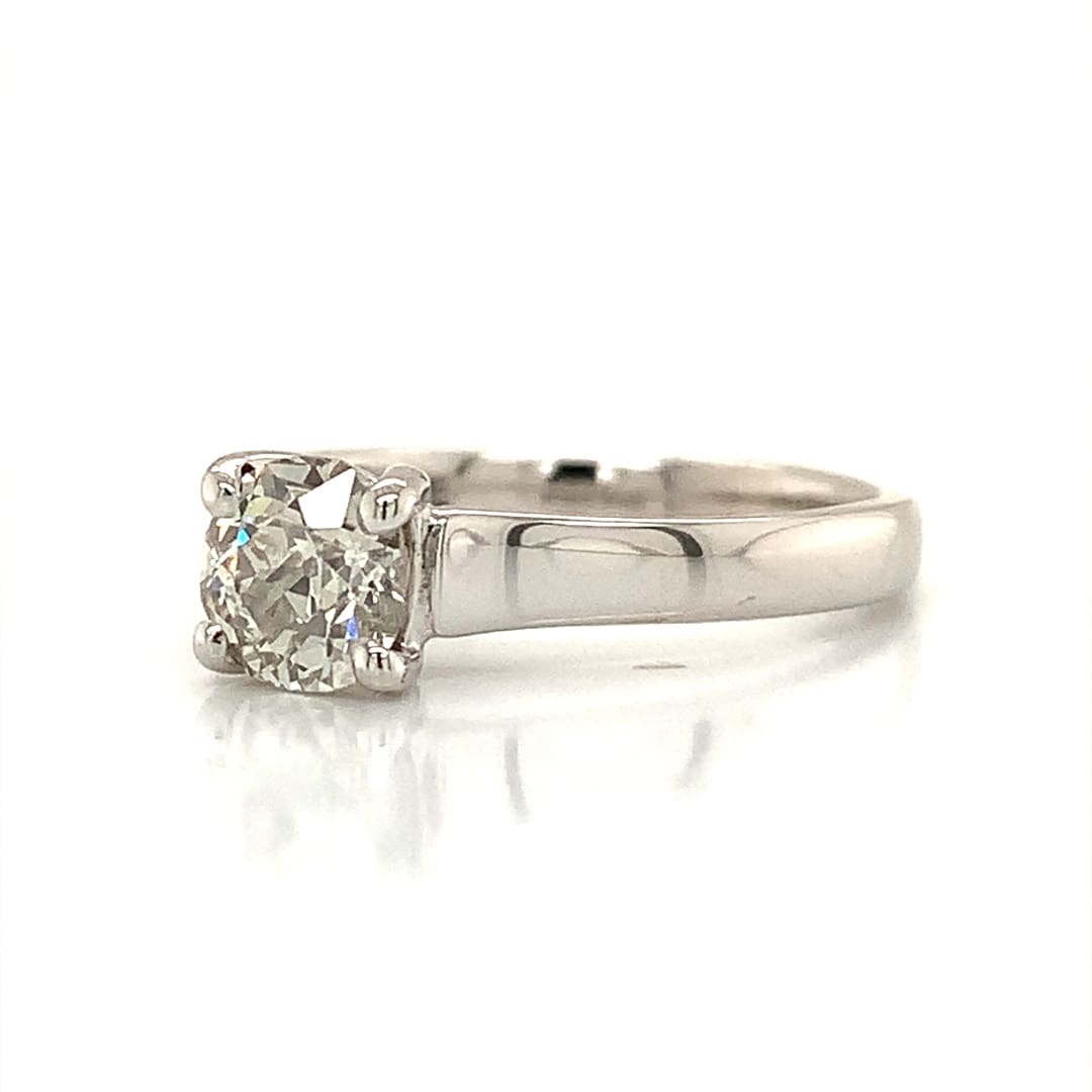 A beautiful white gold solitaire ring set with a 0.75 carat old cut diamond in a modern four claw ‘V’ setting on a sturdy ring with sweeping shoulders. The ring condition is very good.