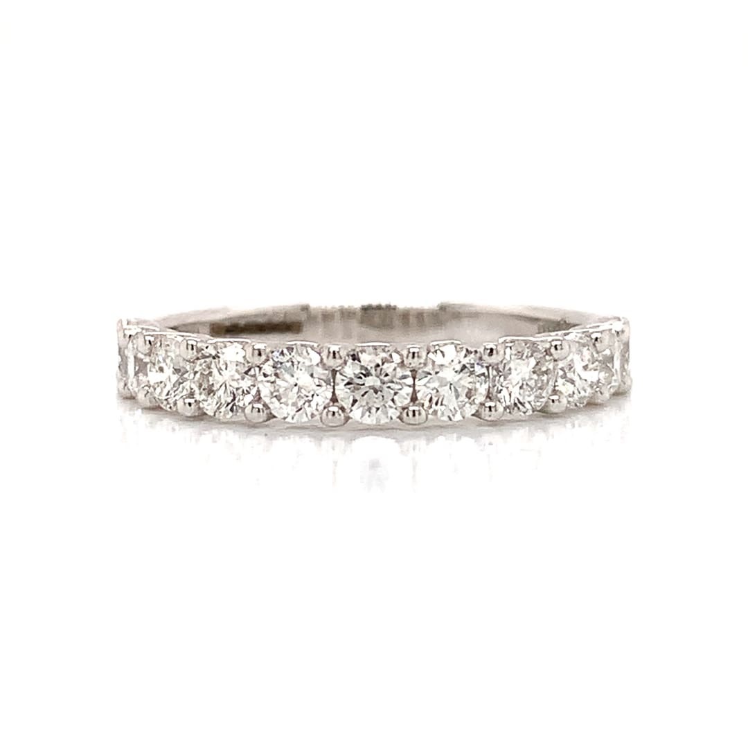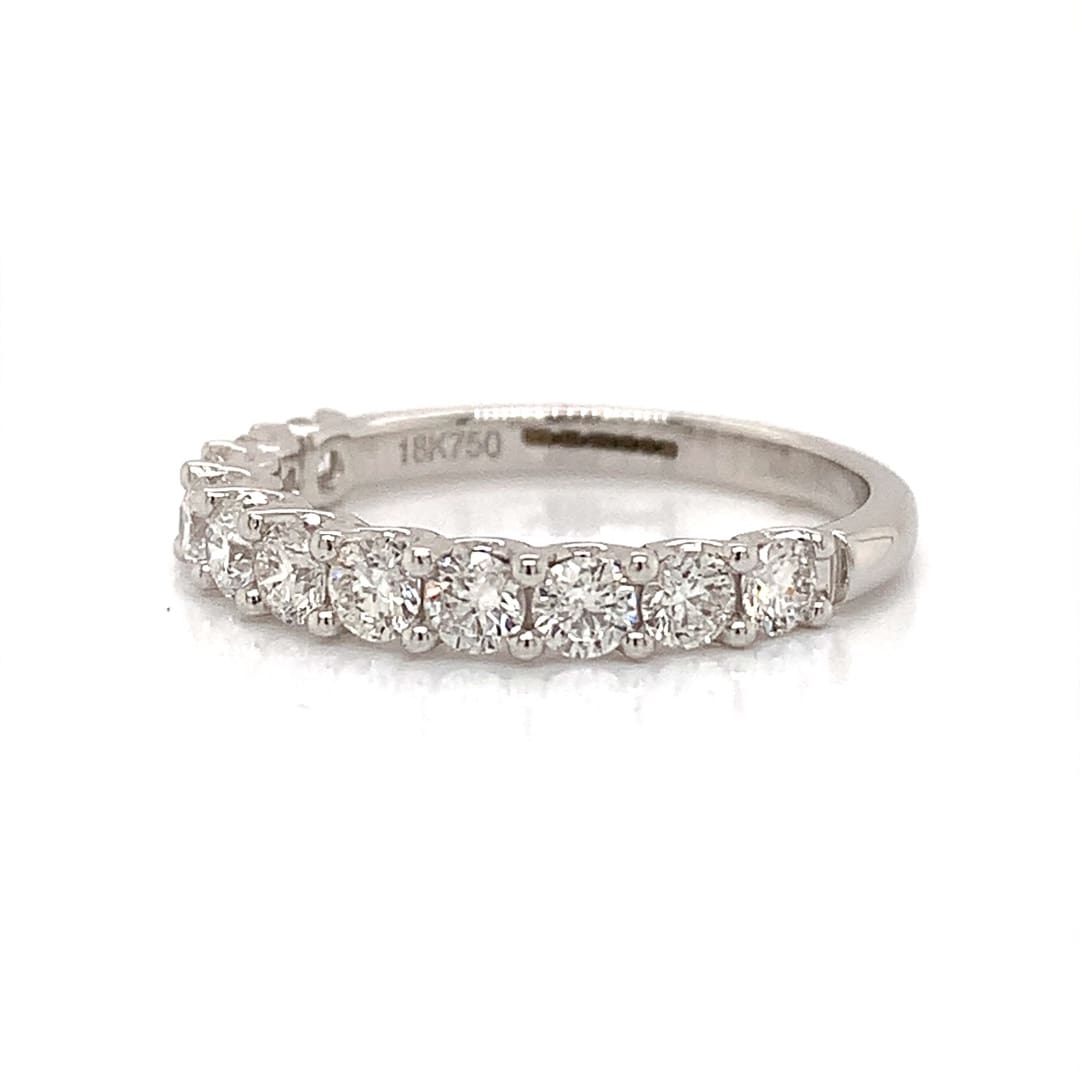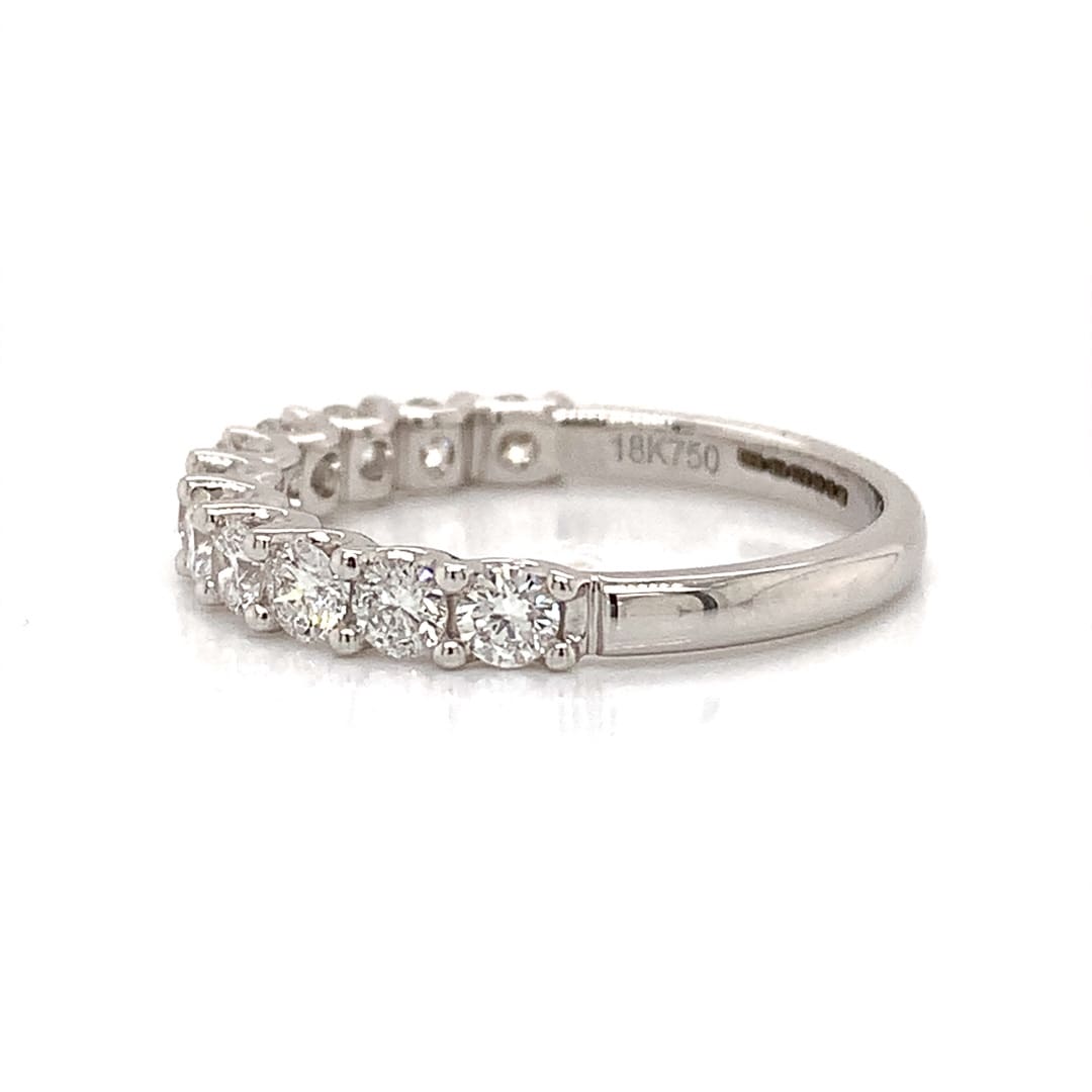 A beautiful eternity ring comprising a row of eleven brilliant cut diamonds, claw set in a white gold scalloped setting.