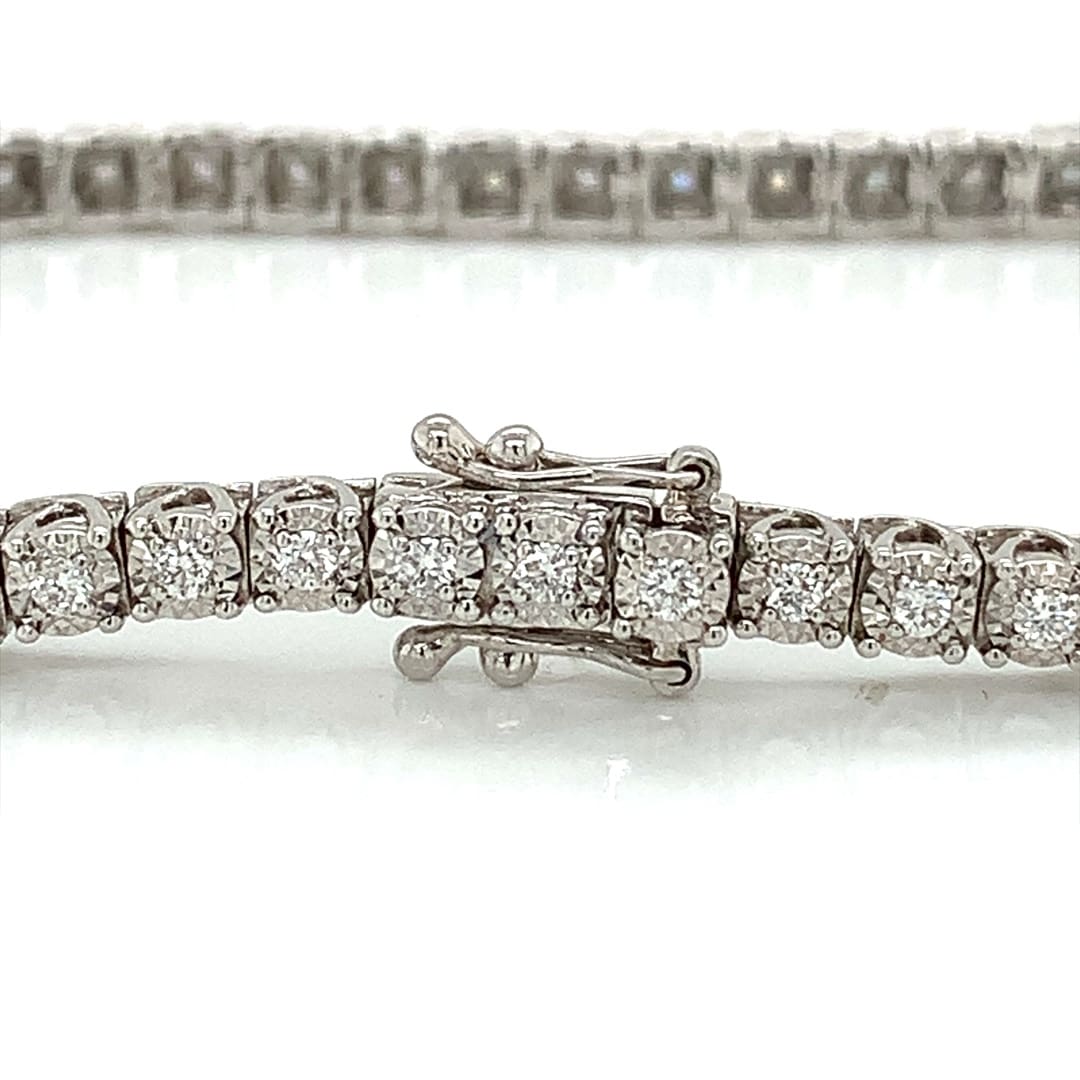 A classic 18 carat white gold bracelet with a row of round brilliant cut diamonds in illusion plate settings.