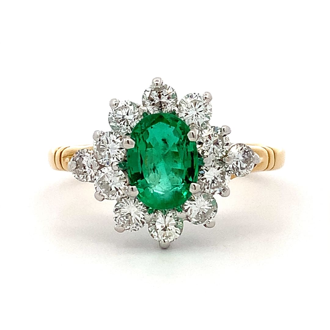 A stunning dress ring comprised of an oval cut emerald framed by bright round brilliant cut diamonds all claw set in white gold over a pretty split shoulder yellow gold ring shank.