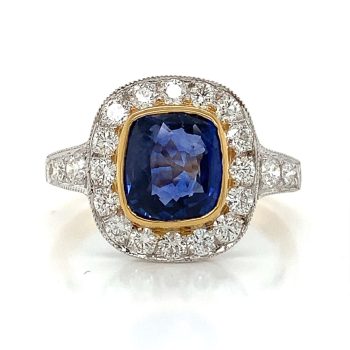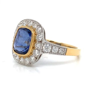 A low set, cushion cut blue sapphire surrounded by brilliant cut diamonds, all in a millgrain edged rub over setting. Each shoulder is pave set with three round cut Diamonds. This ring is a one-off handmade piece.