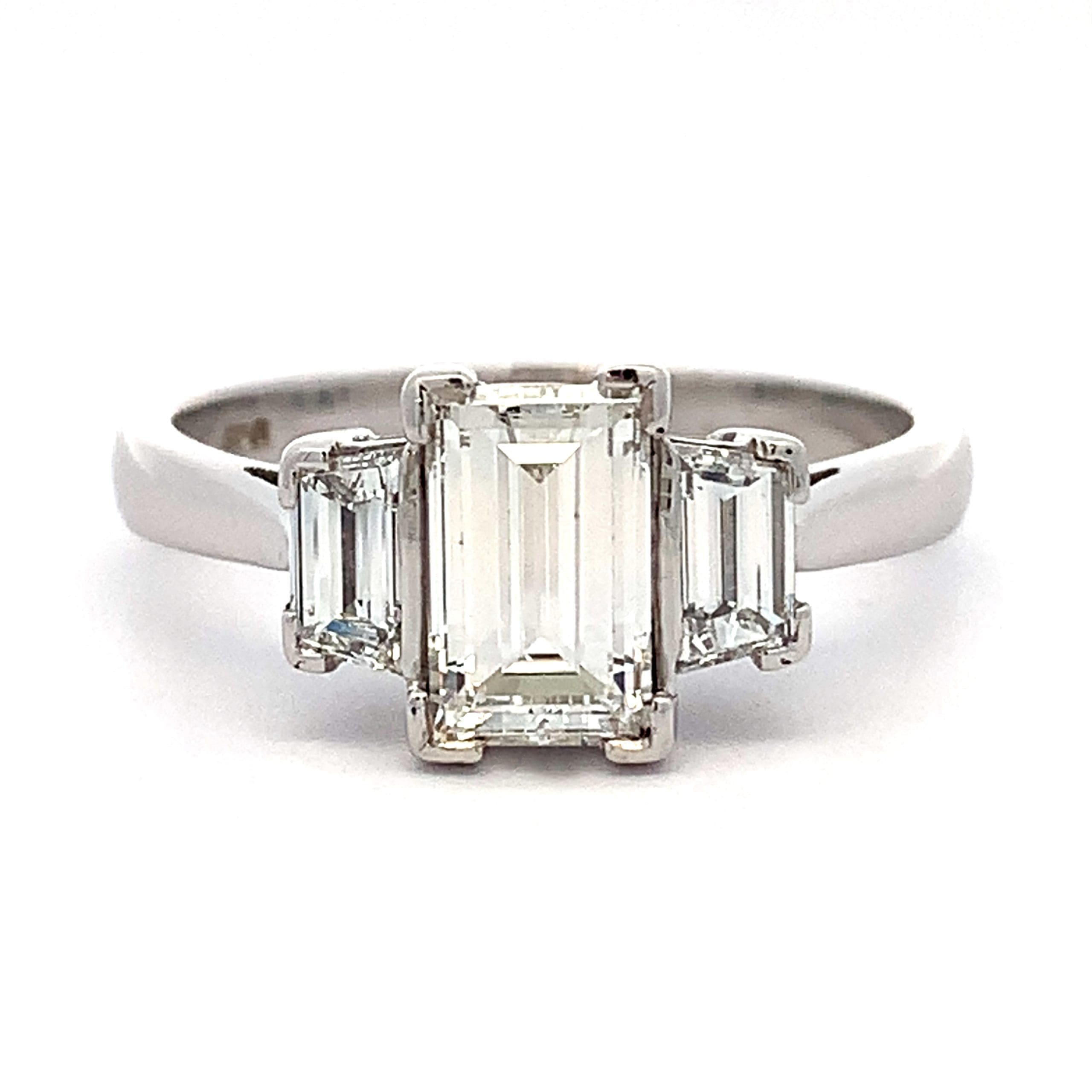 A stunning three stone diamond ring set with a generous baguette cut centre and trapezoid cut outers – all of very good colour and clarity. Made with a strong ring shank and claws.