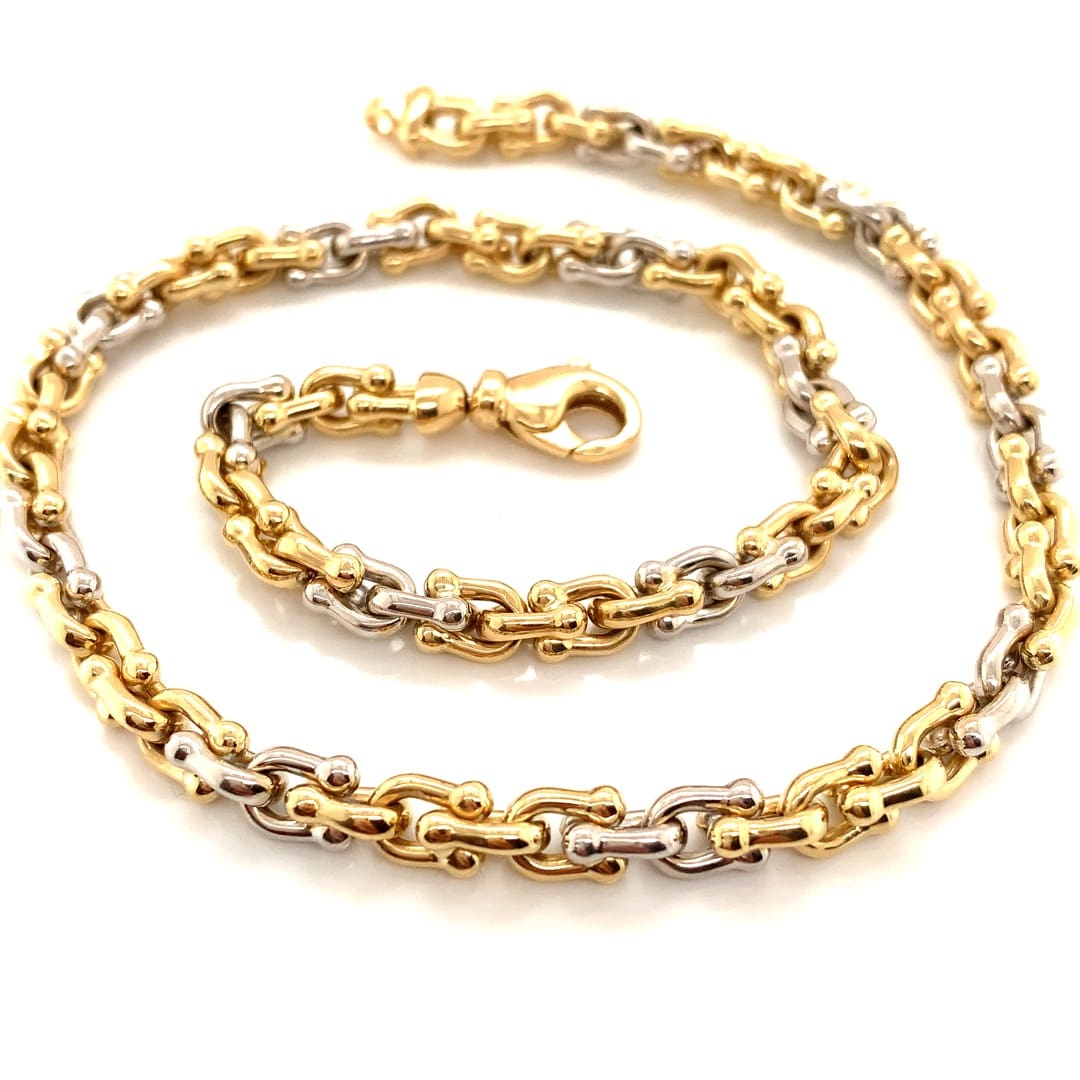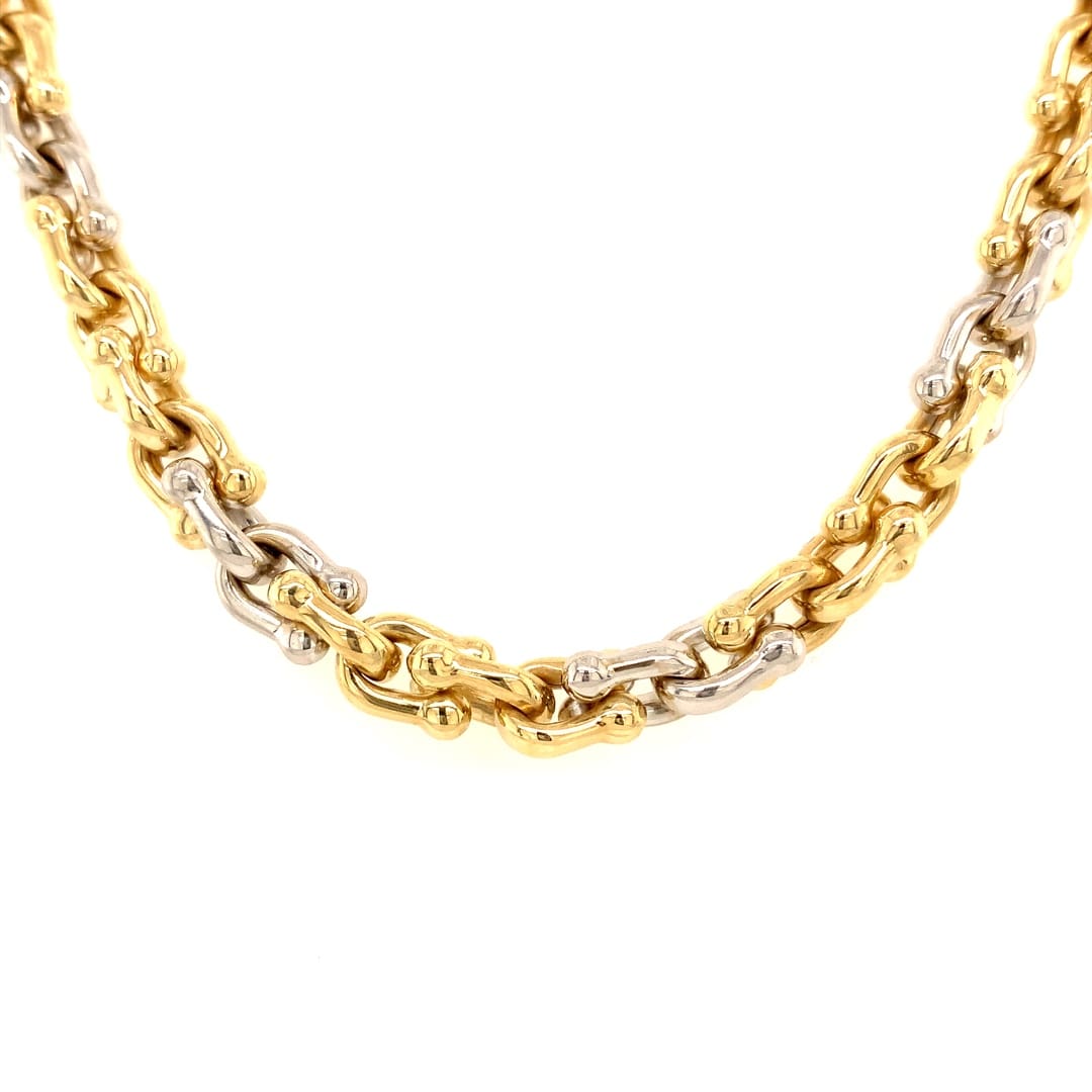 A superb collar necklace with a fancy link design in white and yellow gold.