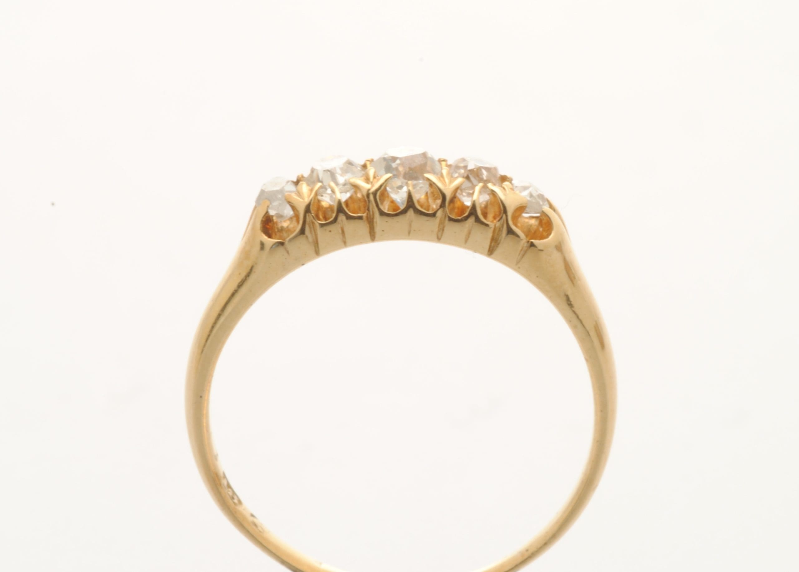 This lovely 18 Carat Yellow Gold ring is set with five old cut Diamonds held with long integral claws, typical of the period.