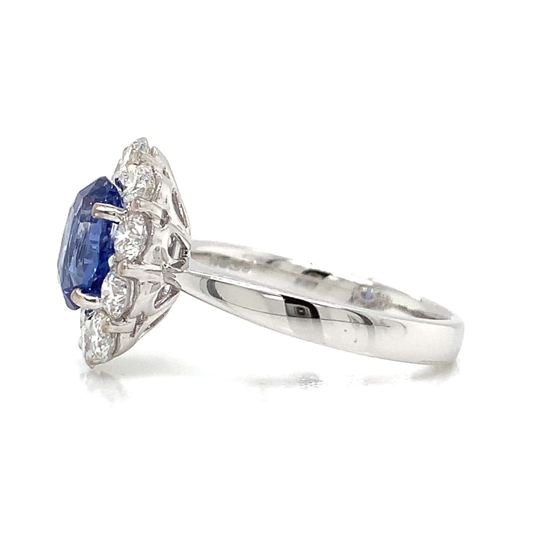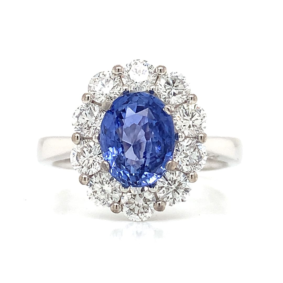 A fantastic 18 carat gold ladies dress ring, set with an oval faceted blue sapphire surrounded by ten round brilliant cut diamonds of good colour and clarity.