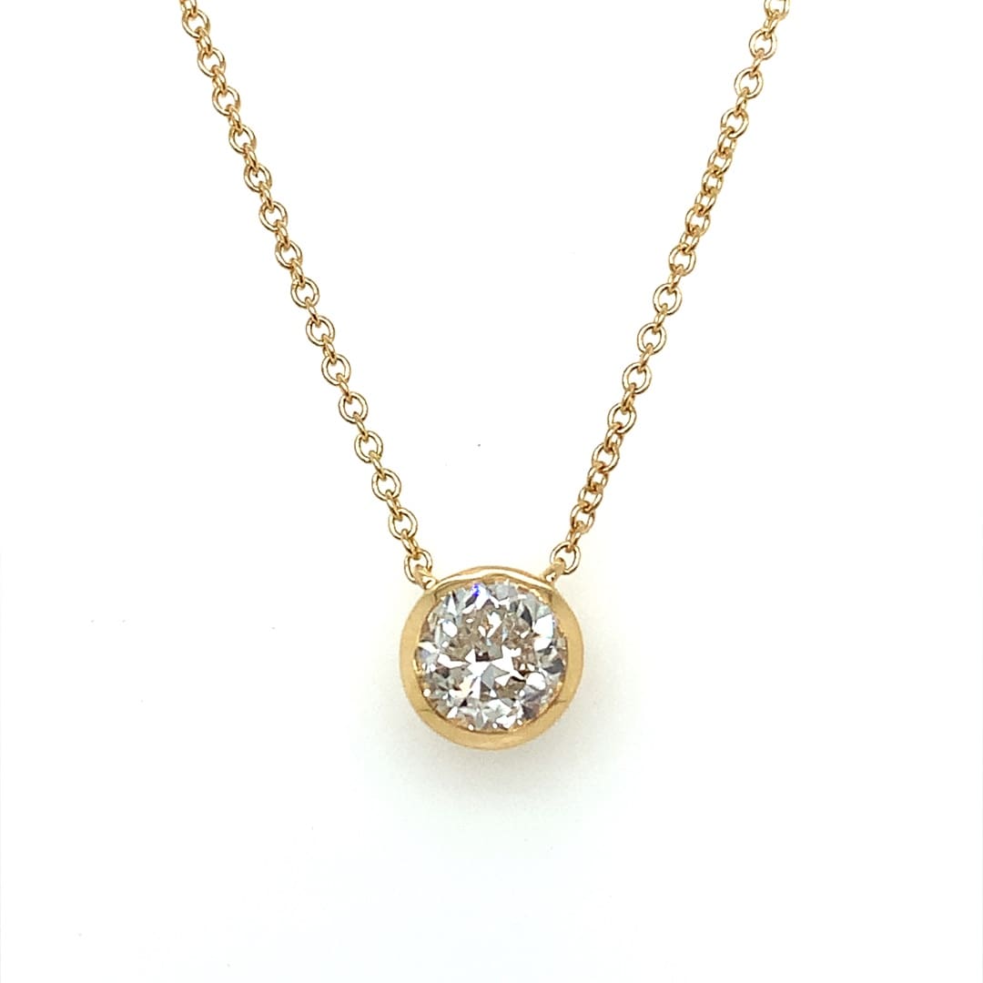 A classic solitaire necklace set with a lively round cut diamond within a smooth rub-over pendant. The pendant is inset to the trace link chain.