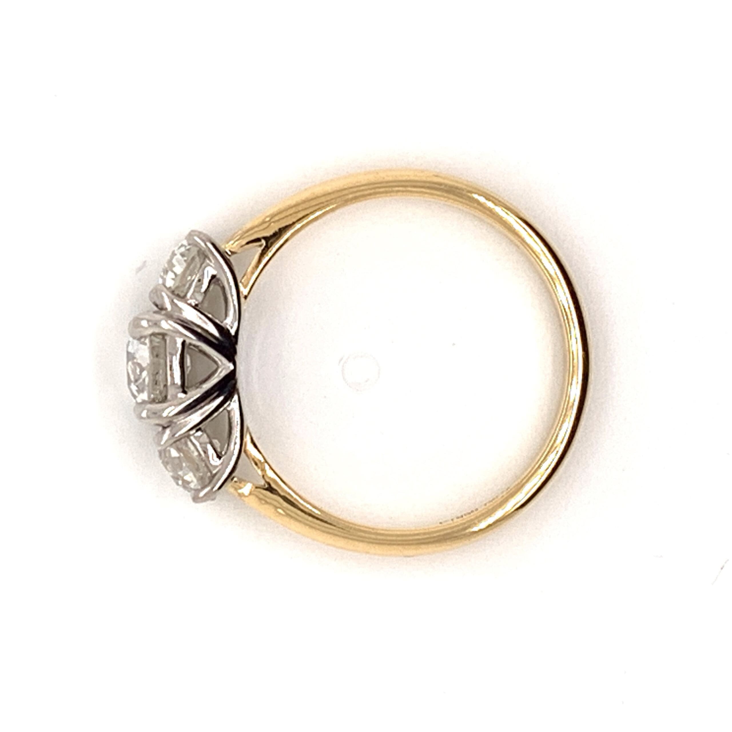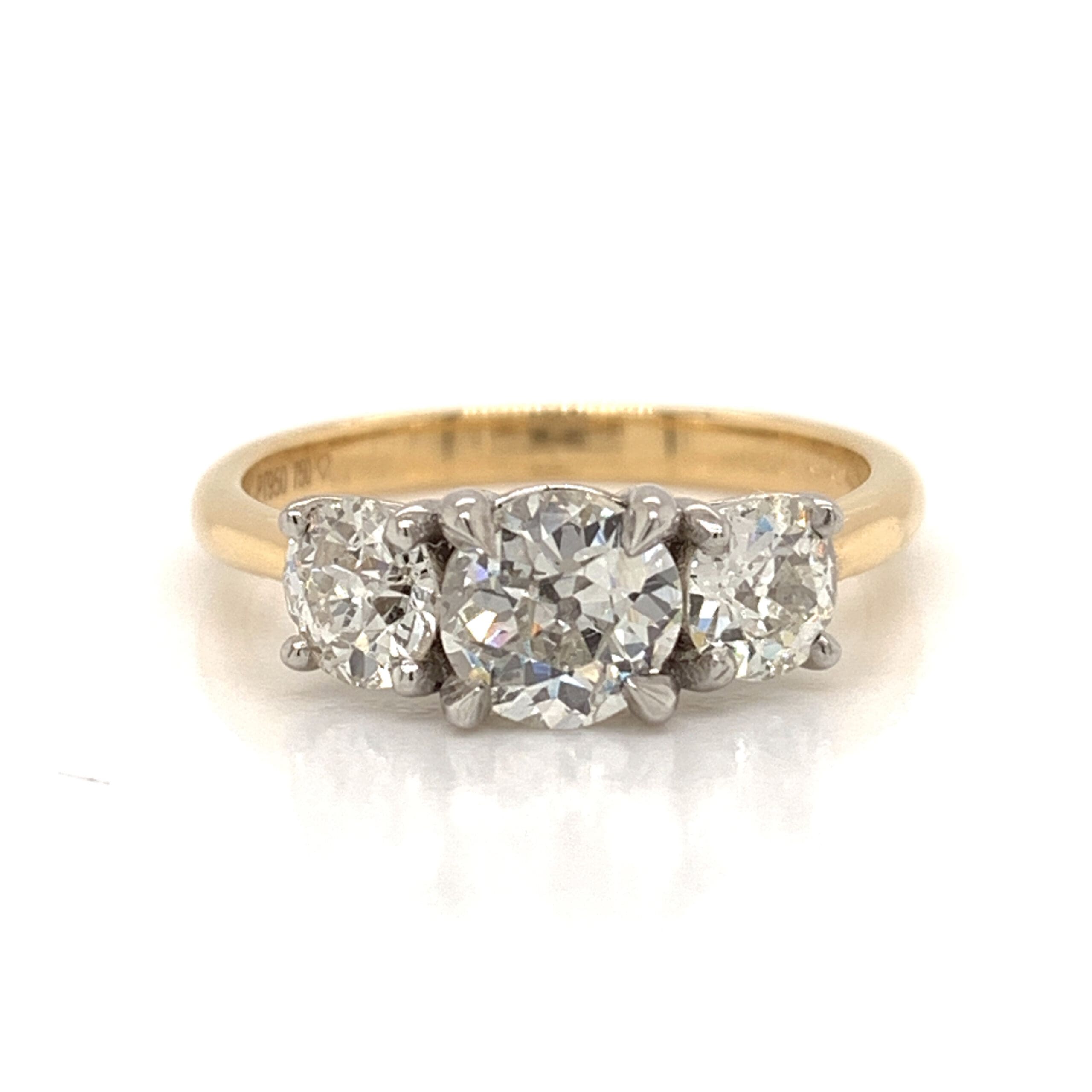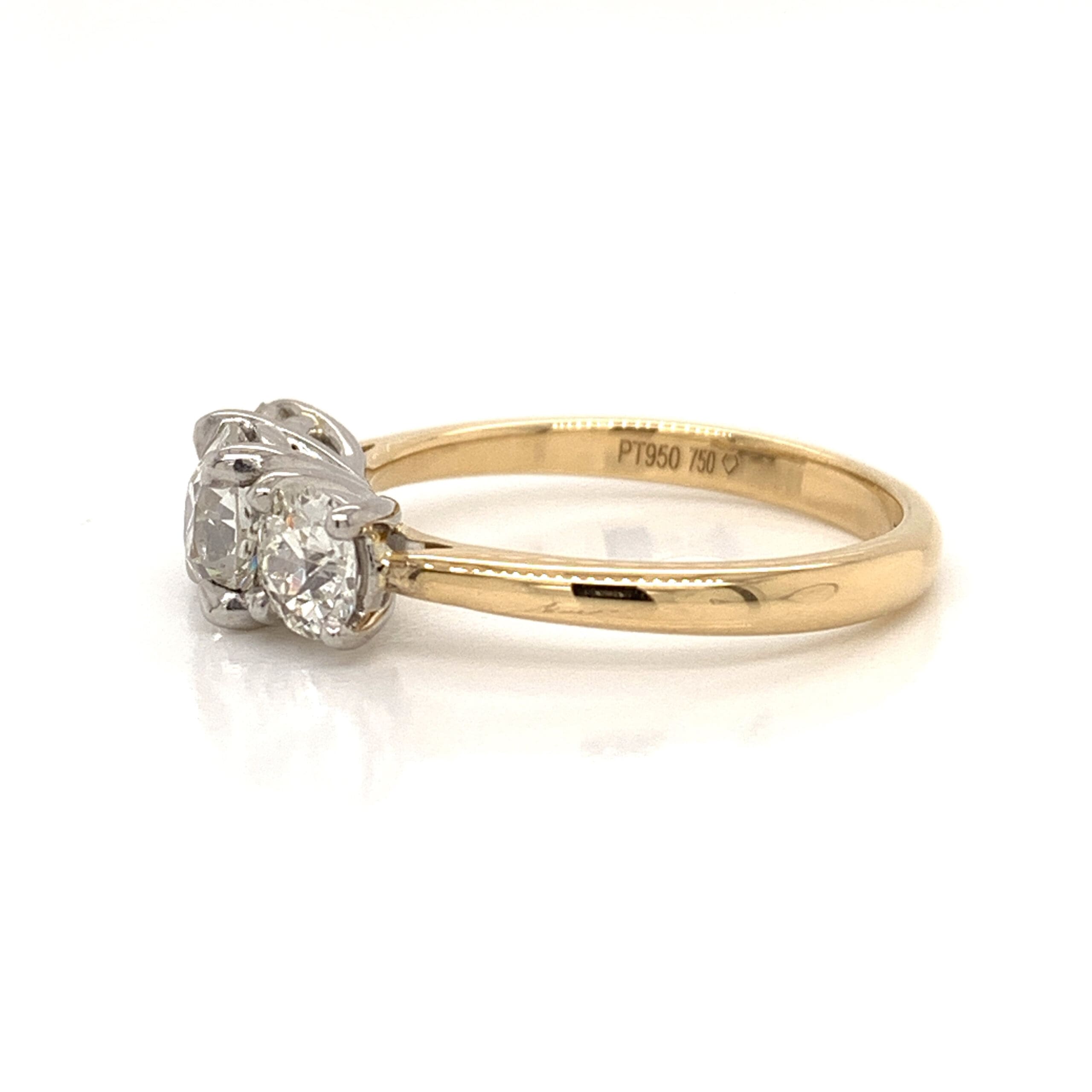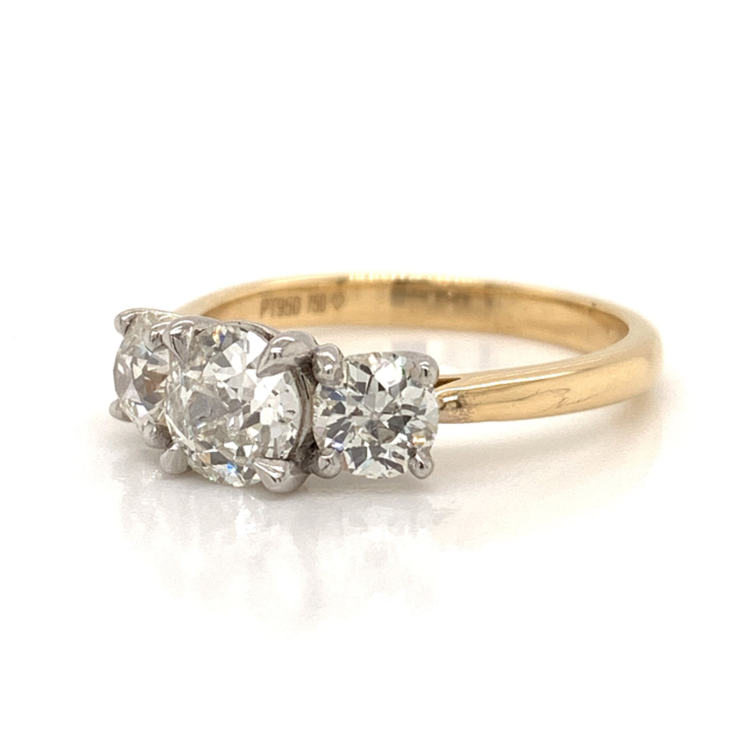 This gorgeous trilogy ring has three old cut Diamonds claw set in an attractive platinum setting on a yellow gold ring.