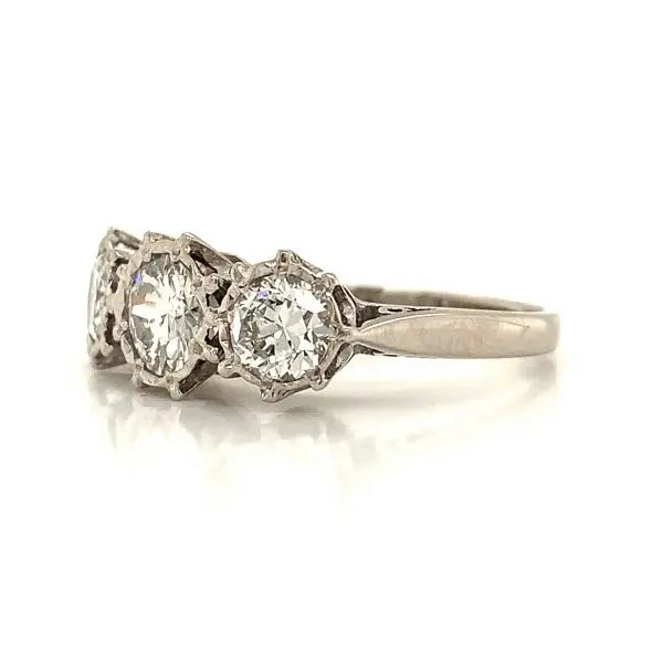 A ladies 18 carat white gold trilogy ring set with three round cut diamonds in a slight illusion plate setting on a rex style under-setting.