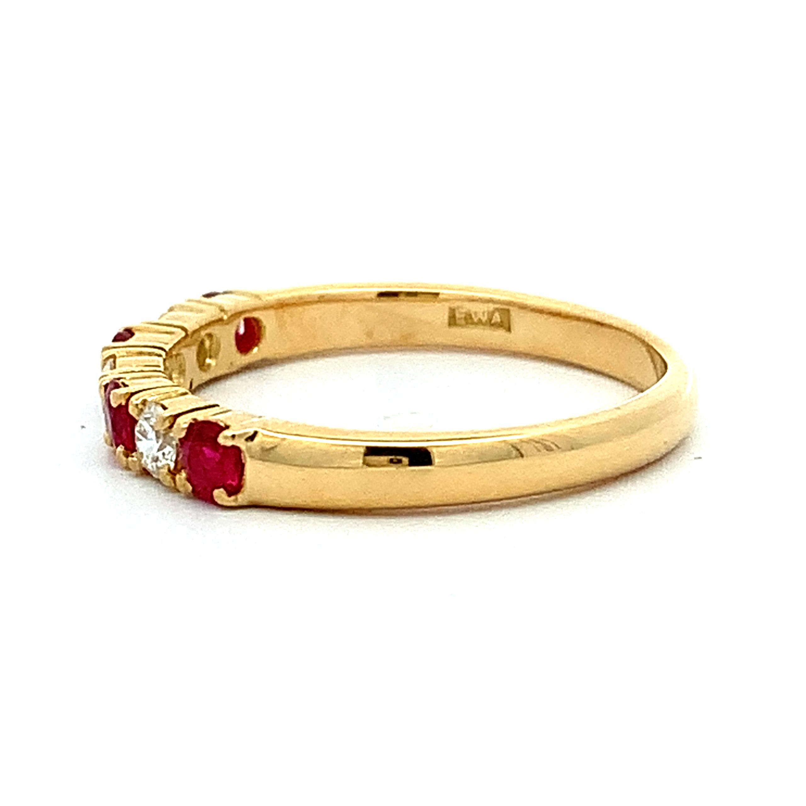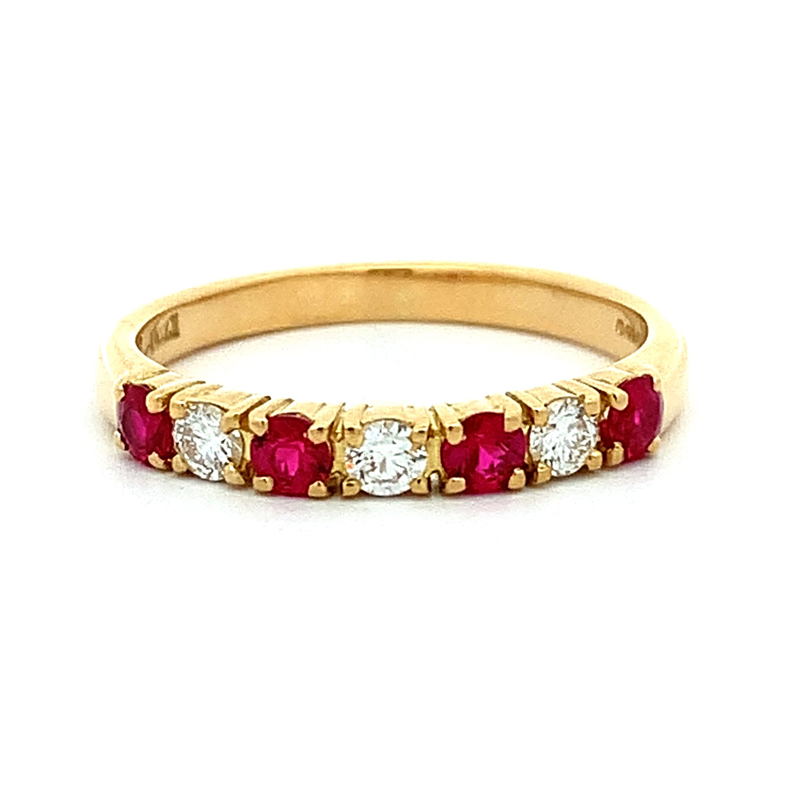 A pretty claw set eternity ring with richly coloured round cut ruby and bright round brilliant cut diamond.
