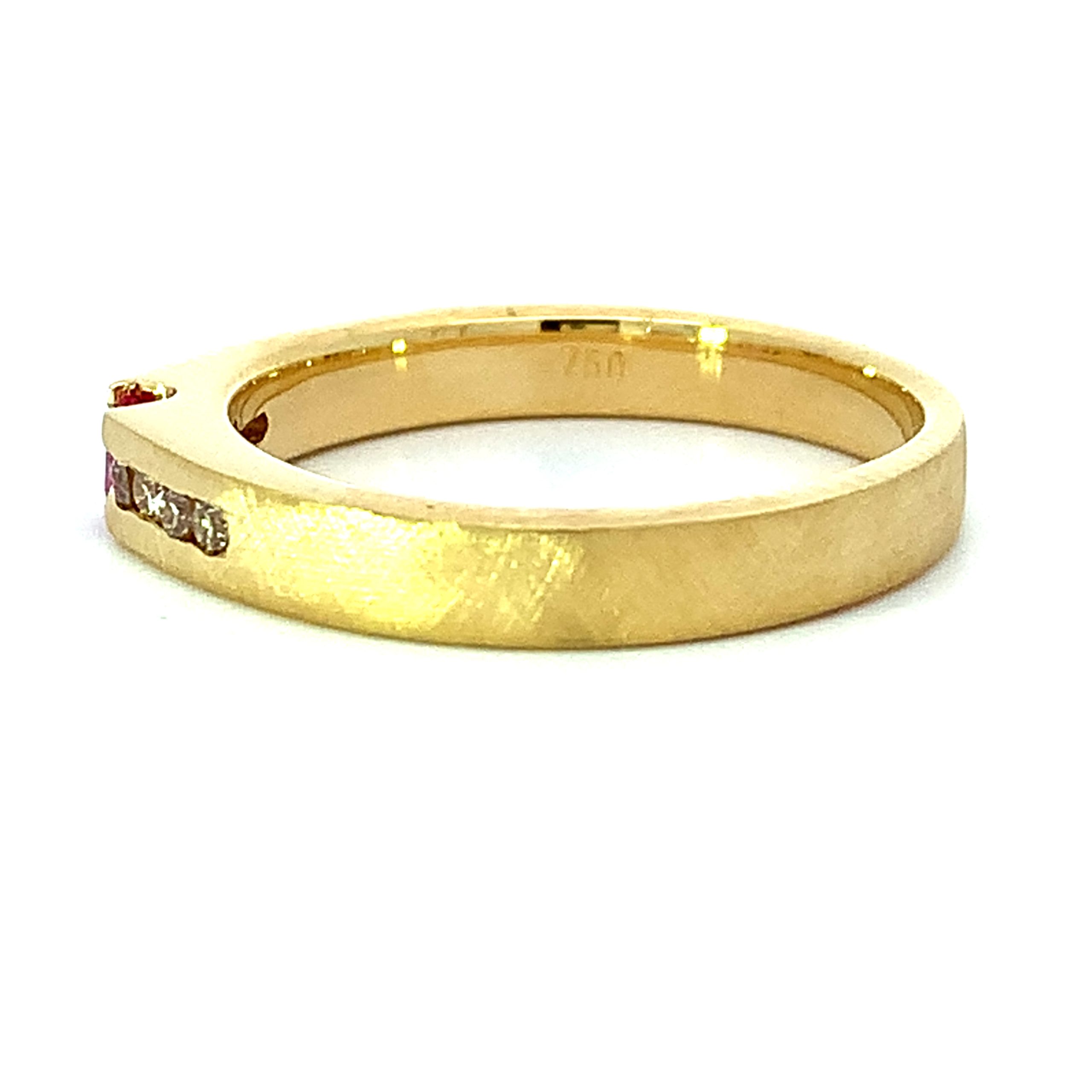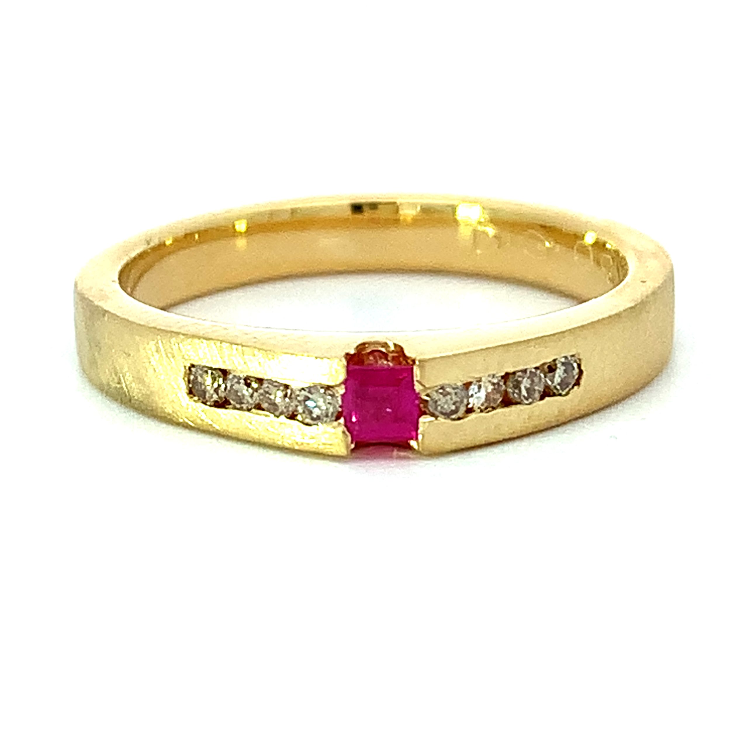A strong matt finish band set with vivid square cut ruby and bright diamond set shoulders.