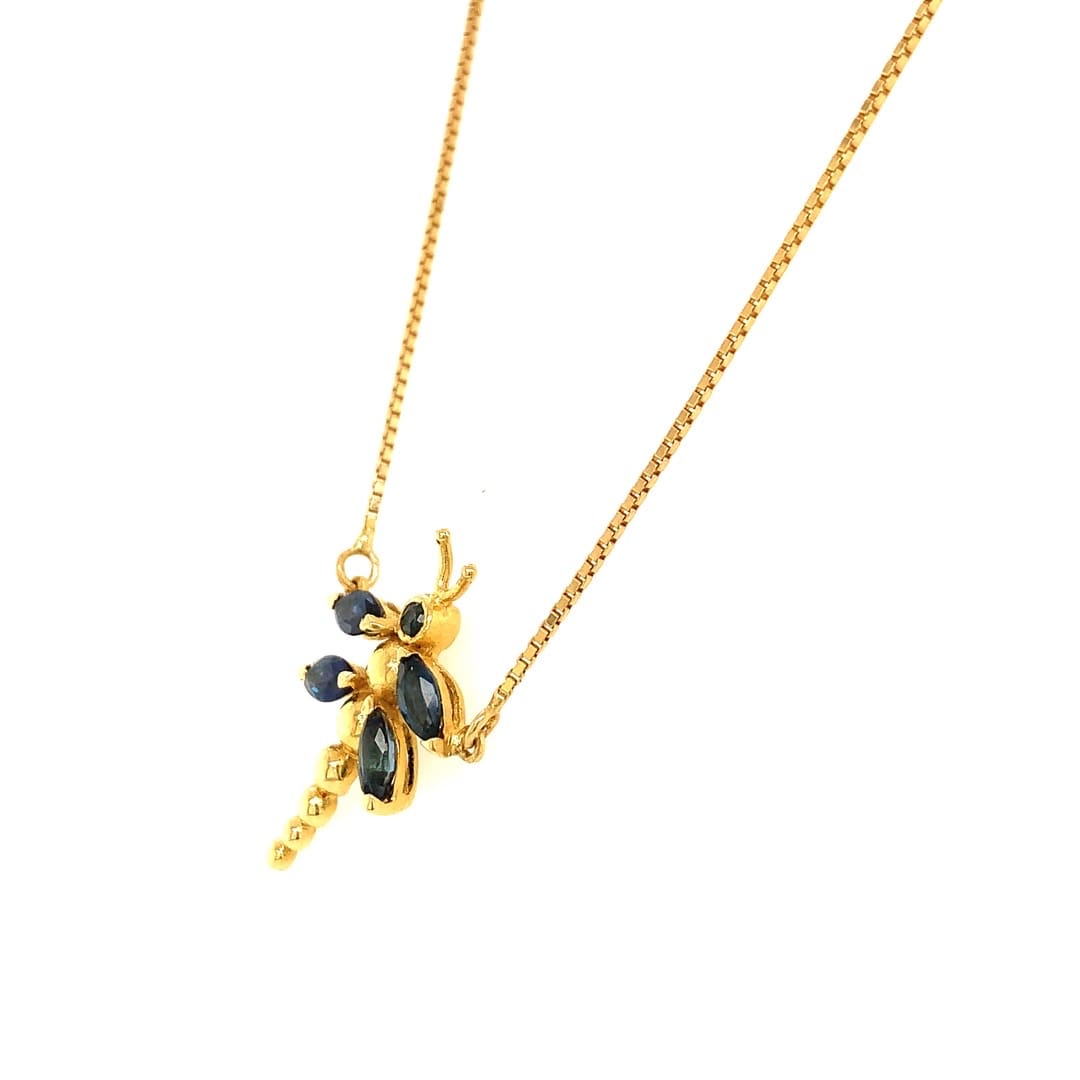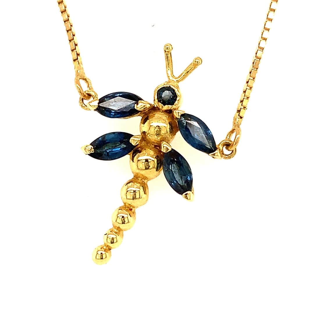 This pretty dragonfly pendant is set with marquise cut sapphires and is inset to a box link chain with a secure clasp.