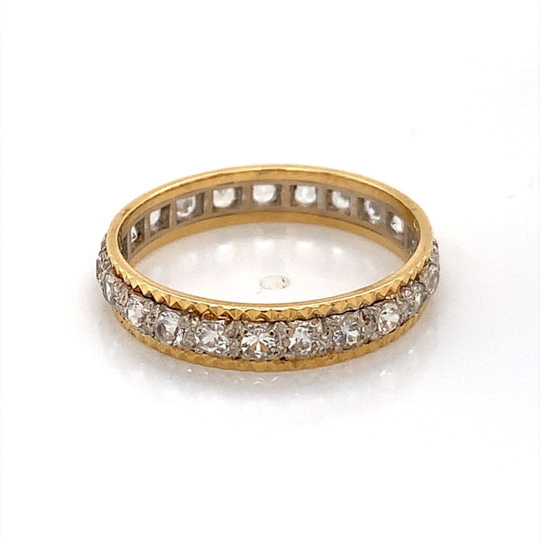 A vintage textured eternity ring fully set with round cut white topaz in a white gold setting between yellow gold outer bands.