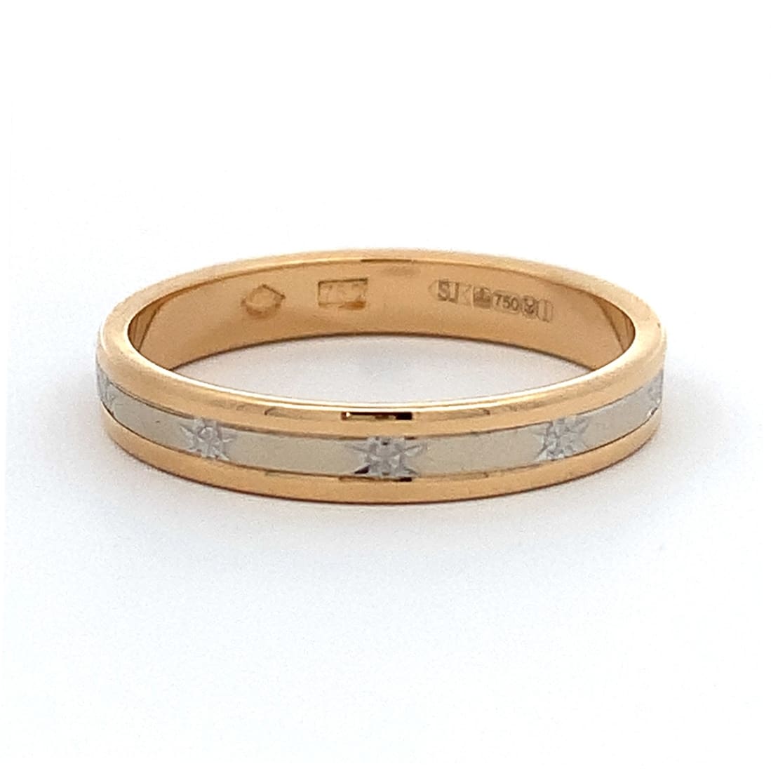 A lovely two colour gold ladies band with sparkling illusion engraving.