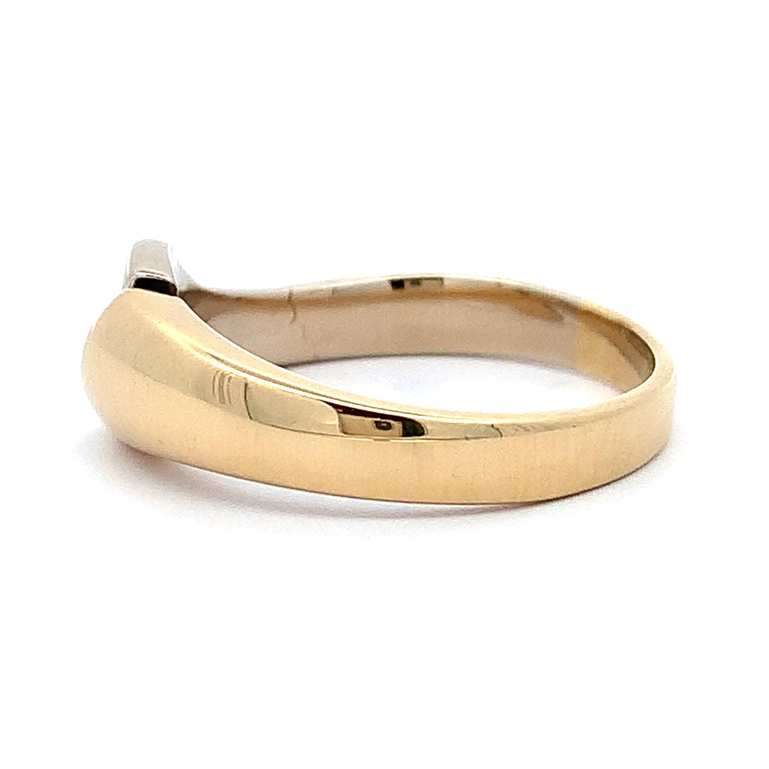 A modern split top ring set with a bright brilliant cut diamond. A strong solidly made ring with a polished finish.