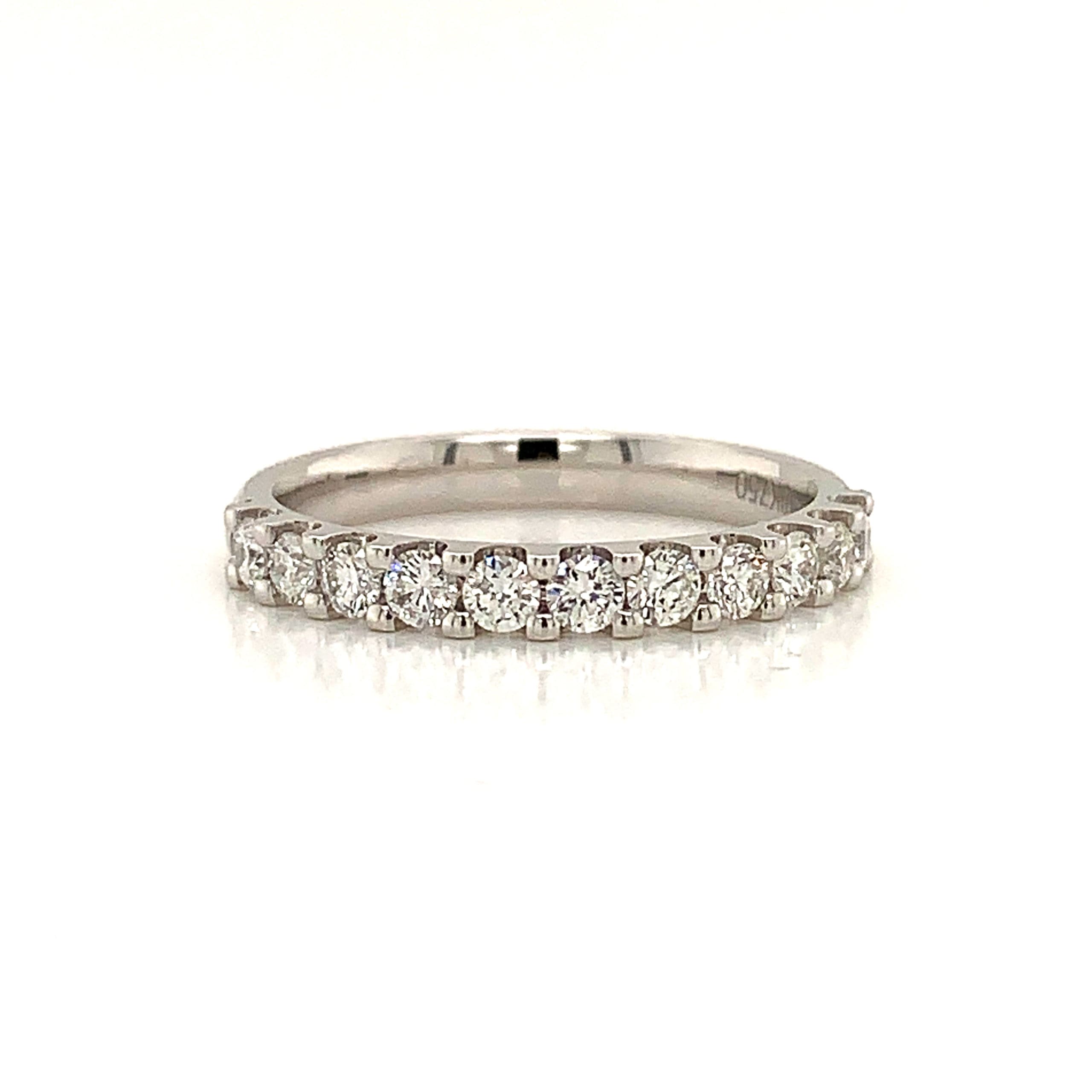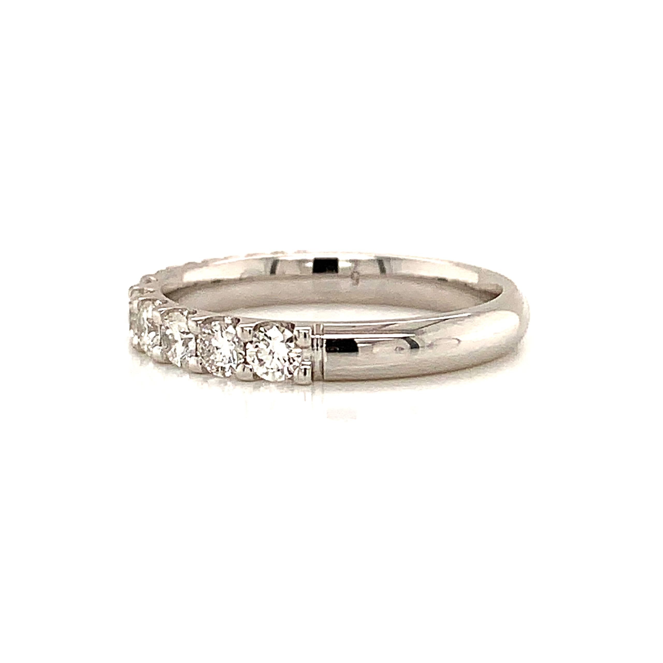 A very pretty eternity ring with eleven close-set round brilliant cut diamonds of good colour and clarity in a white gold scalloped setting.