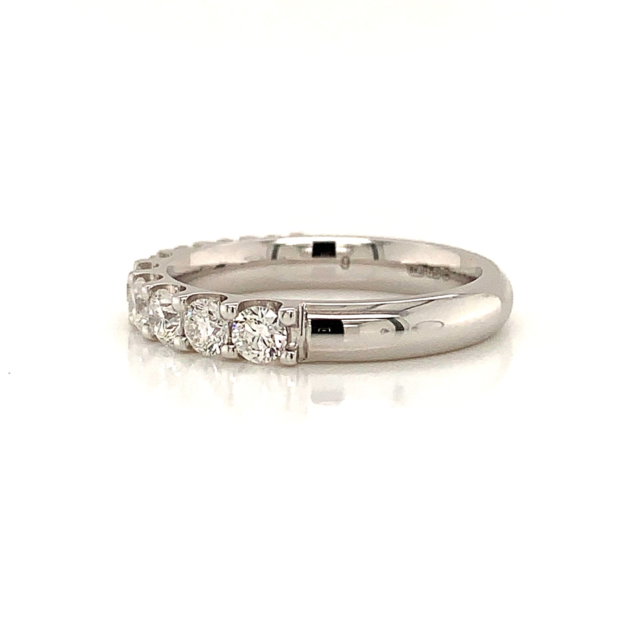 A very pretty eternity ring with nine close-set round brilliant cut diamonds of good colour and clarity in a white gold scalloped setting.