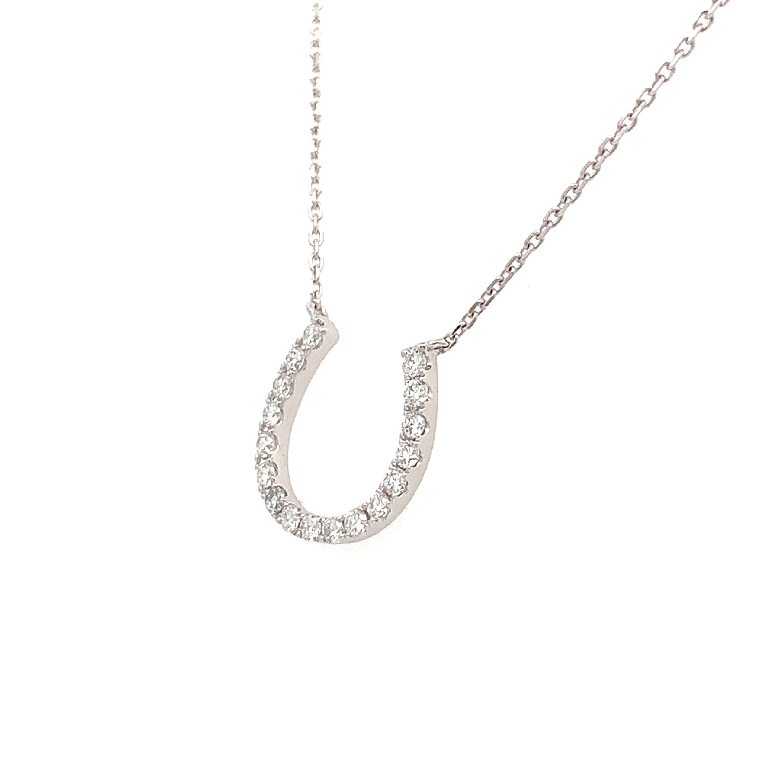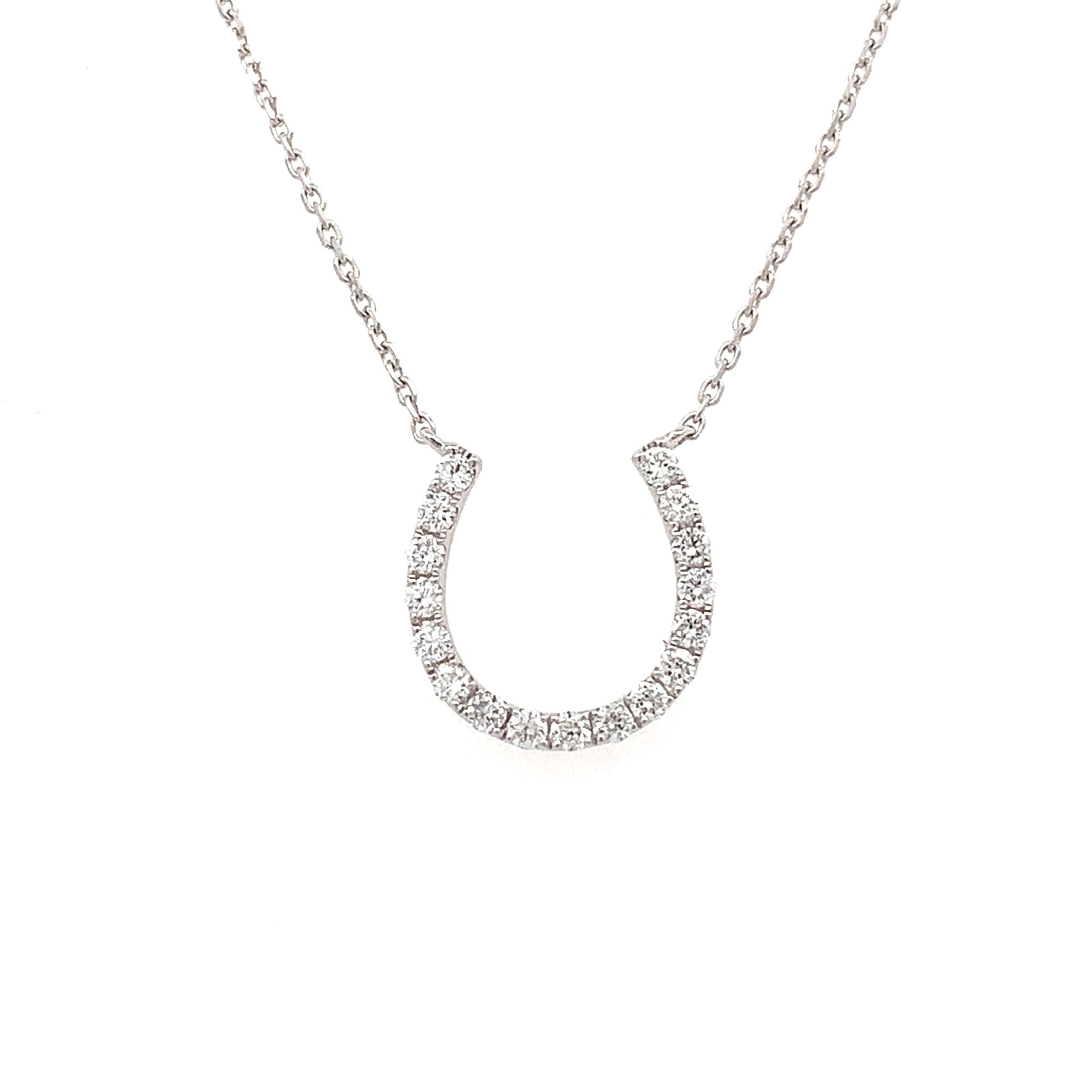 A pretty white gold horseshoe pendant pave set with round brilliant cut diamond on a sparkling fine trace chain.