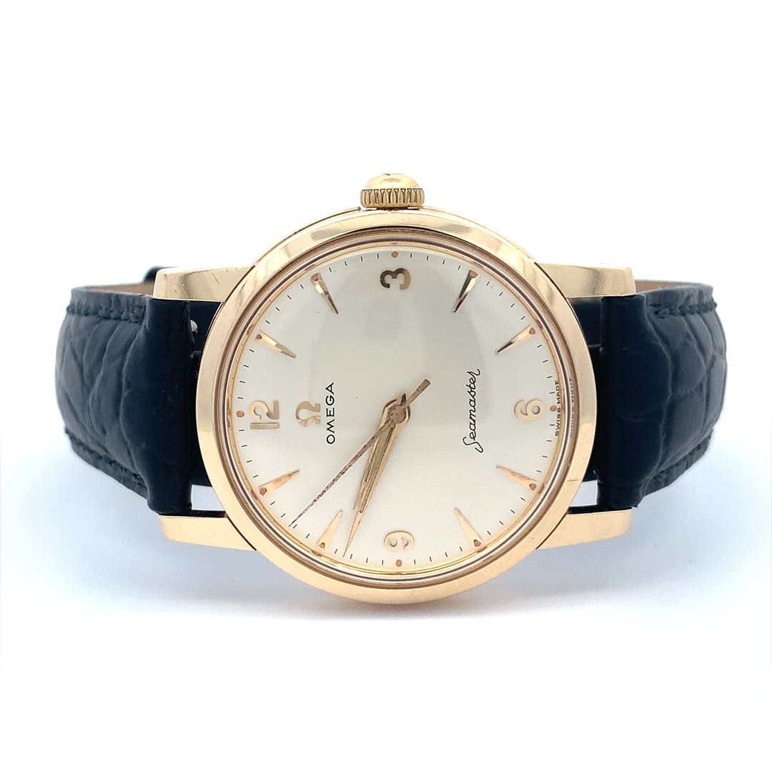 A classic vintage Omega Seamaster gents watch in superb condition. With an elegant 9ct solid gold case with a polished finish. Polished gold hands and hour batons over a matte silver dial. Powered by a hand-wound mechanical movement. Original Omega buckle on a new stitched Hirsch black leather strap.