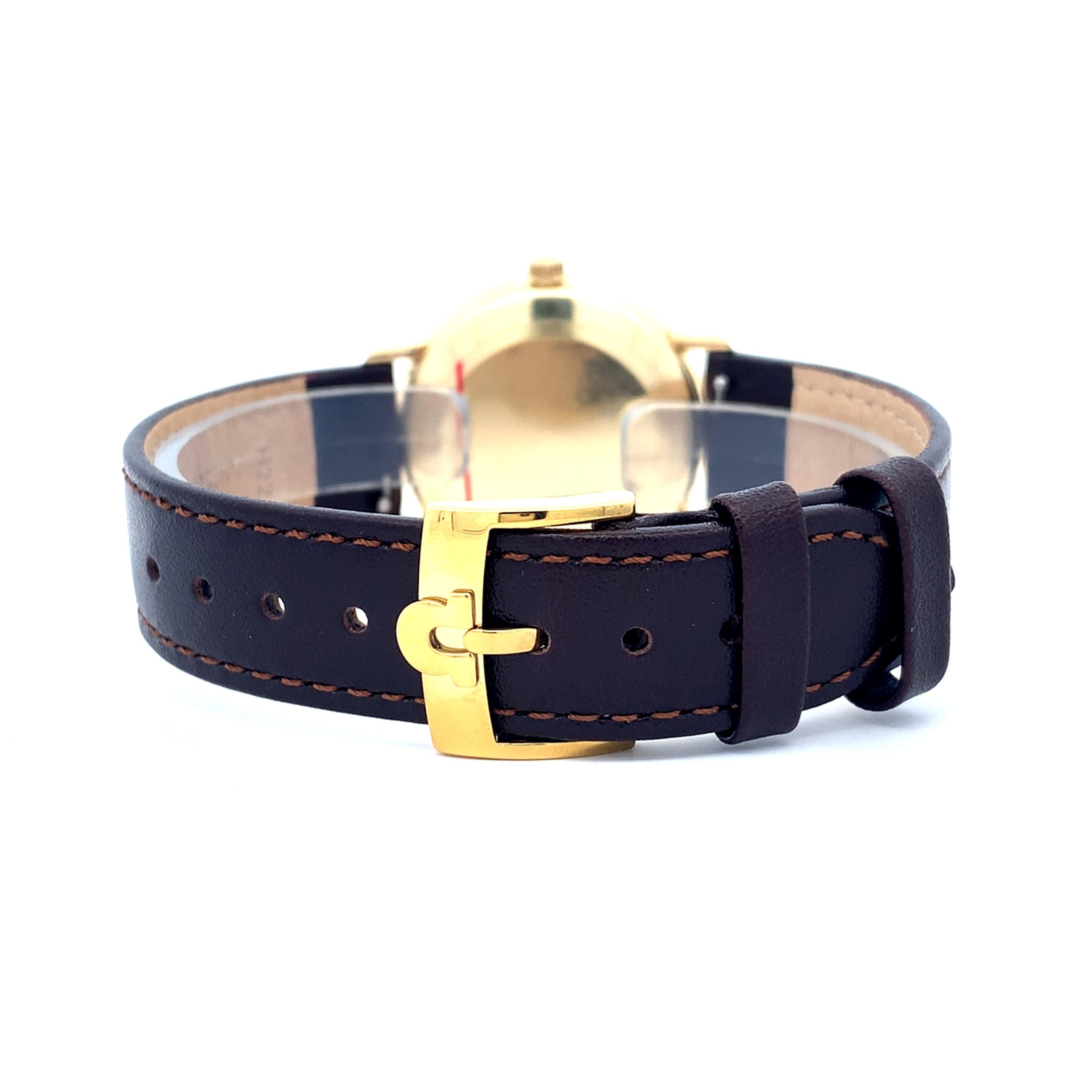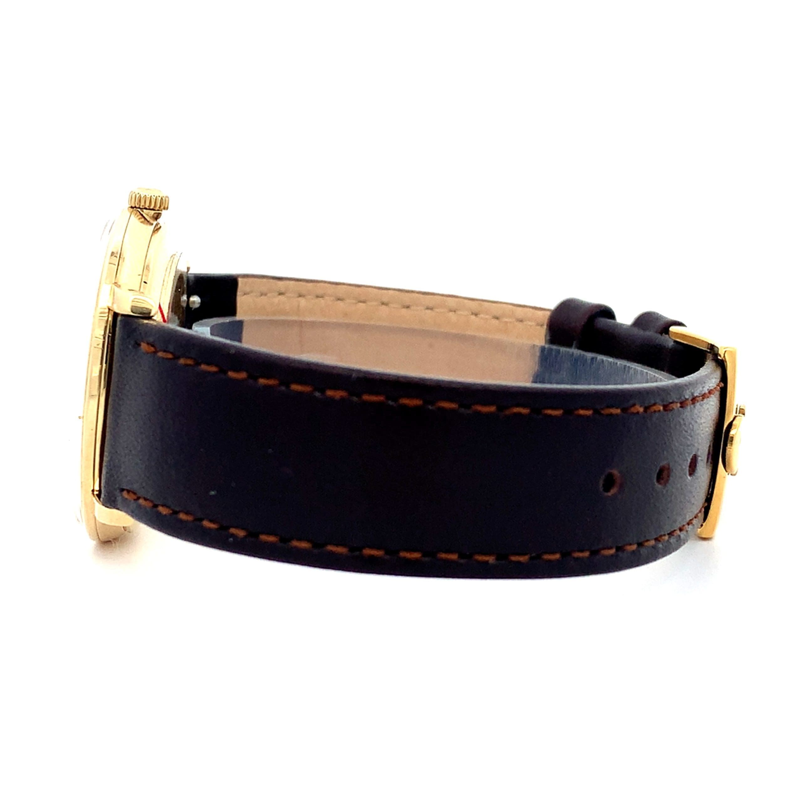 Brushed silver dial under polished gold hands and hour batons. Clear date window at 3 O’clock with rapid date setting function by pressing the crown toward the case advances the date by one day. Genuine Omega buckle on a new stitched Hirsch leather strap.