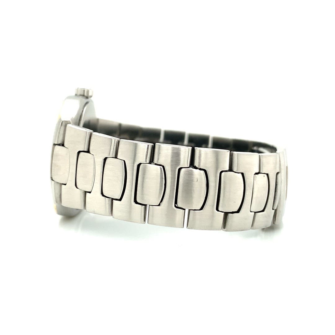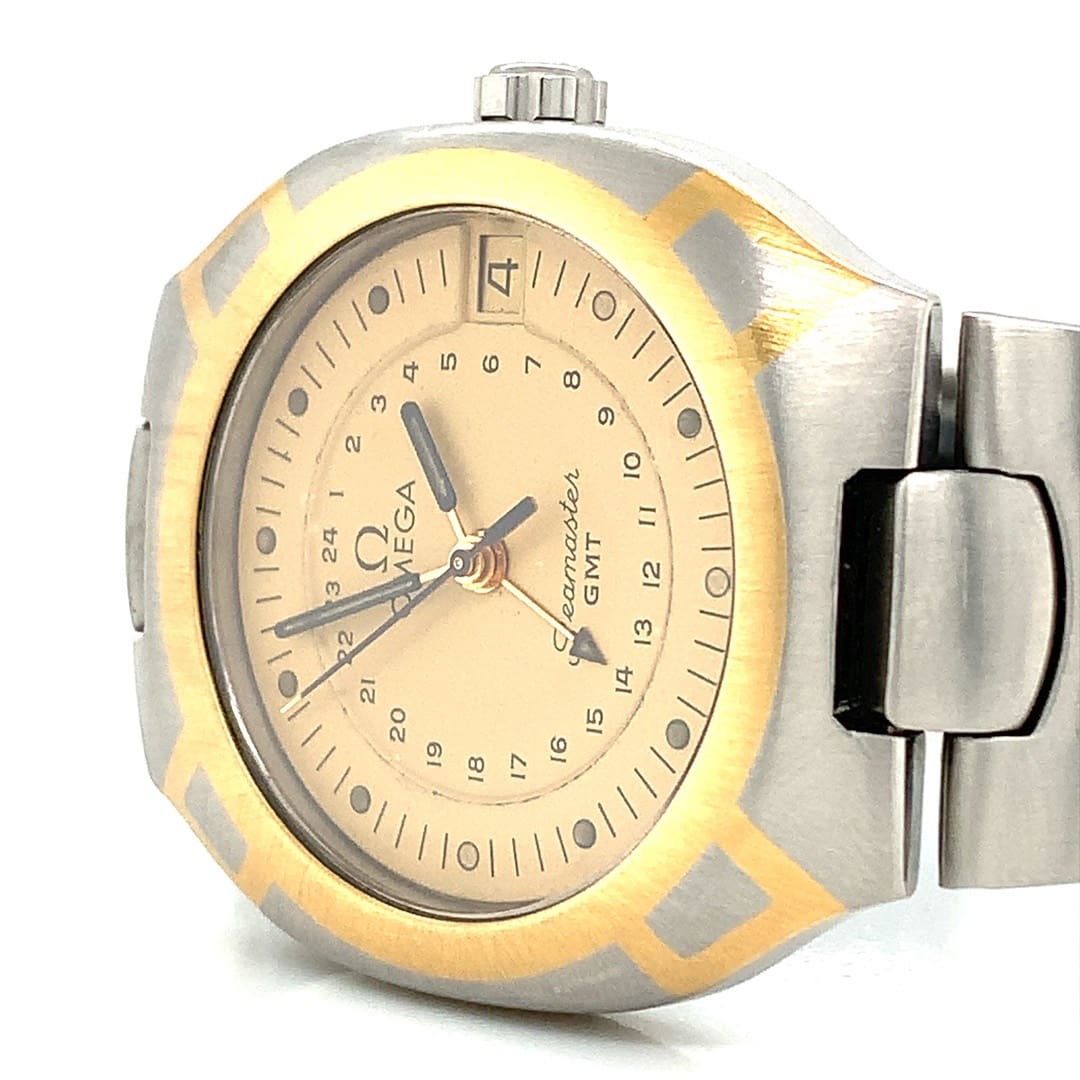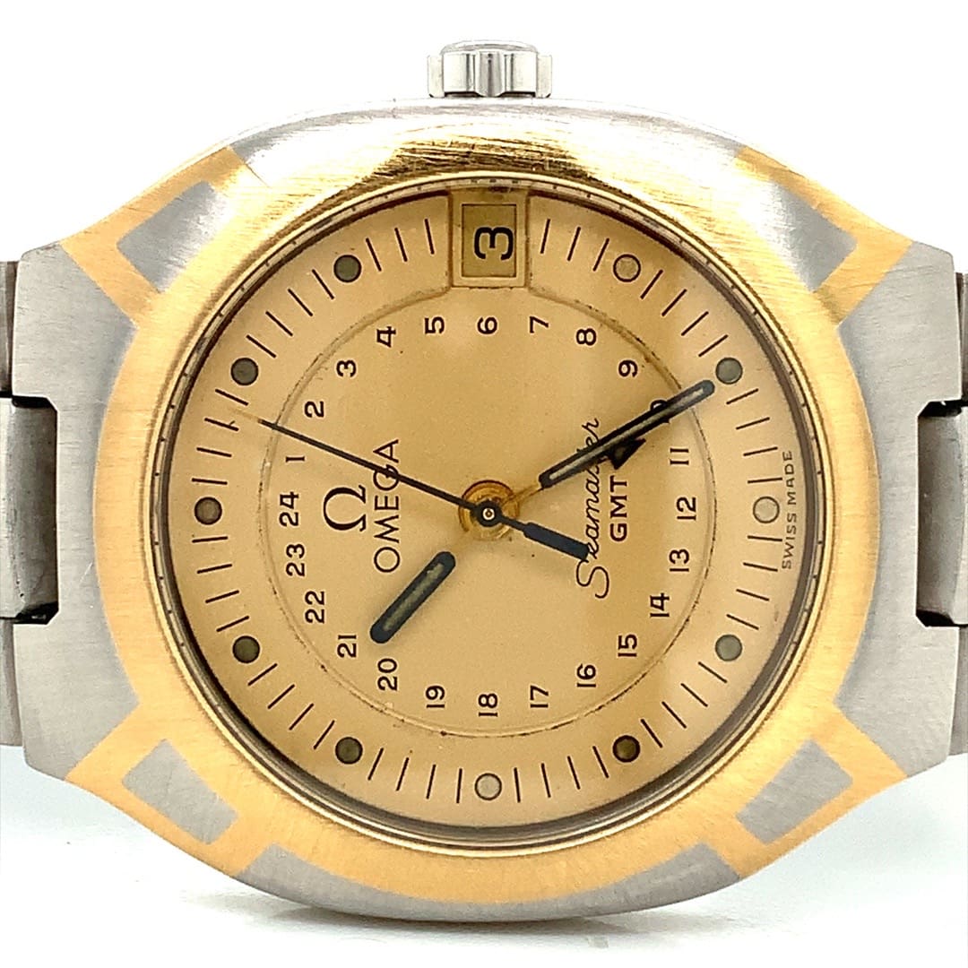 A vintage iconic watch from Omega with a slim steel case inlayed with 18ct gold. Layered matt gold dial with date window and seconds hand. GMT function. Brushed steel case and bracelet with button release gold inlay folding clasp .