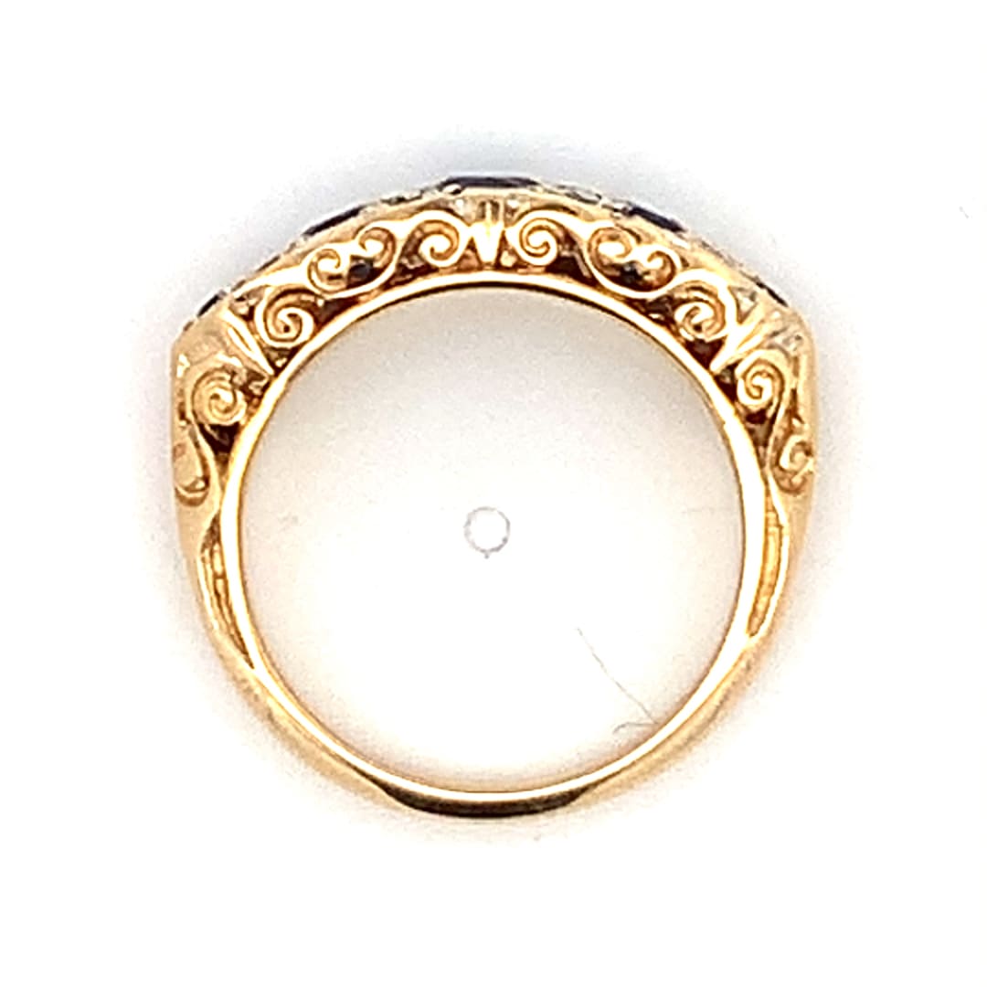 A carve style ring featuring a row of round cut blue sapphire with small accent diamonds.