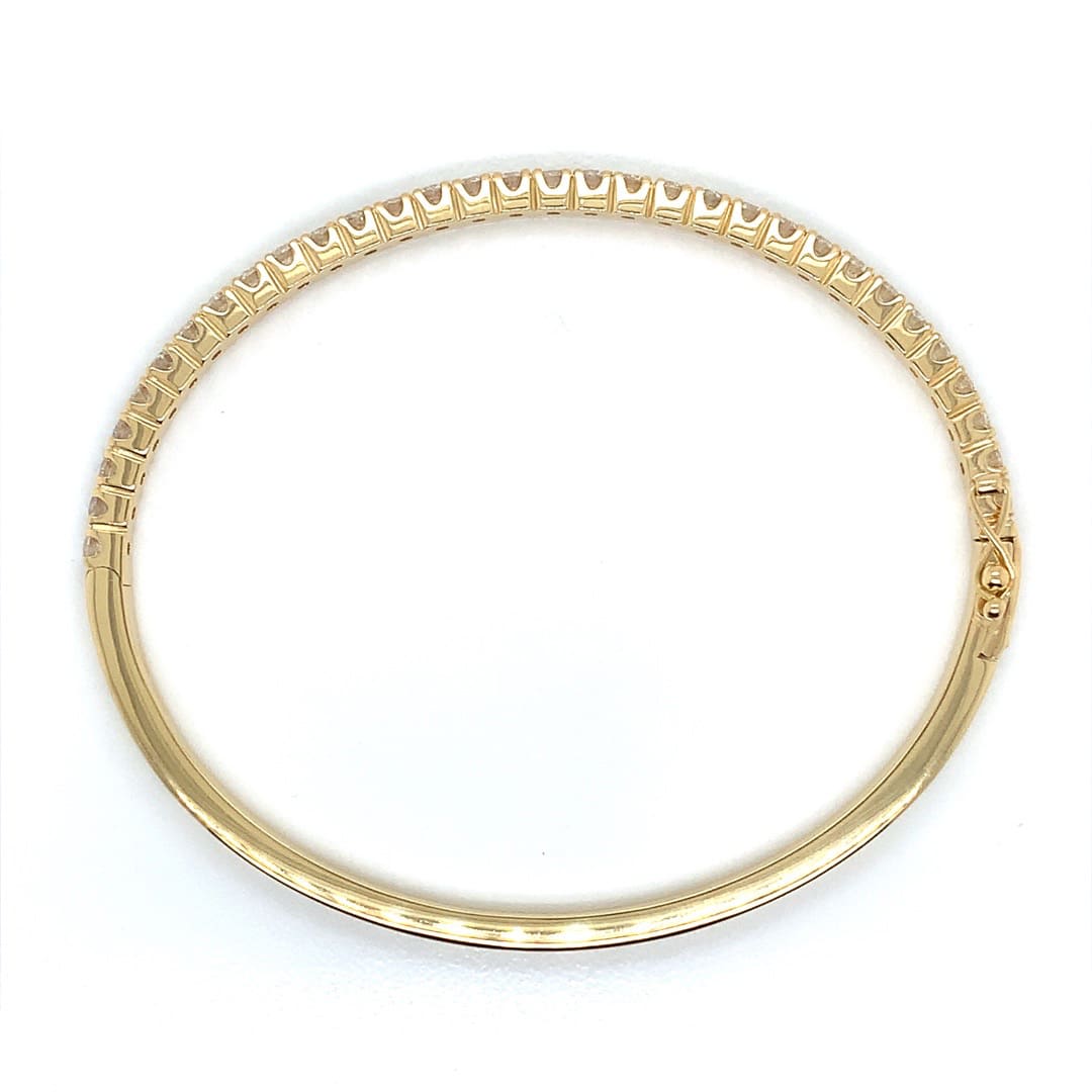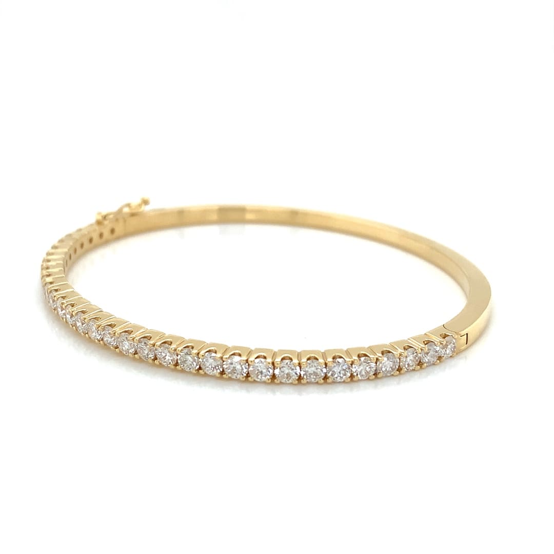 A wonderful hinged bangle, half set with bright round brilliant cut diamonds in elegant scalloped settings. This weighty bangle is fitted with a secure lever release box clasp and additional safety catch.