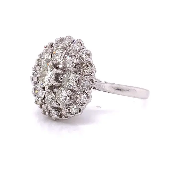 A stunning display of round brilliant cut diamonds claw set in a round cluster design. This vintage white gold ring has a tall hand-wired undersetting and traditional chenier split shank shoulders.