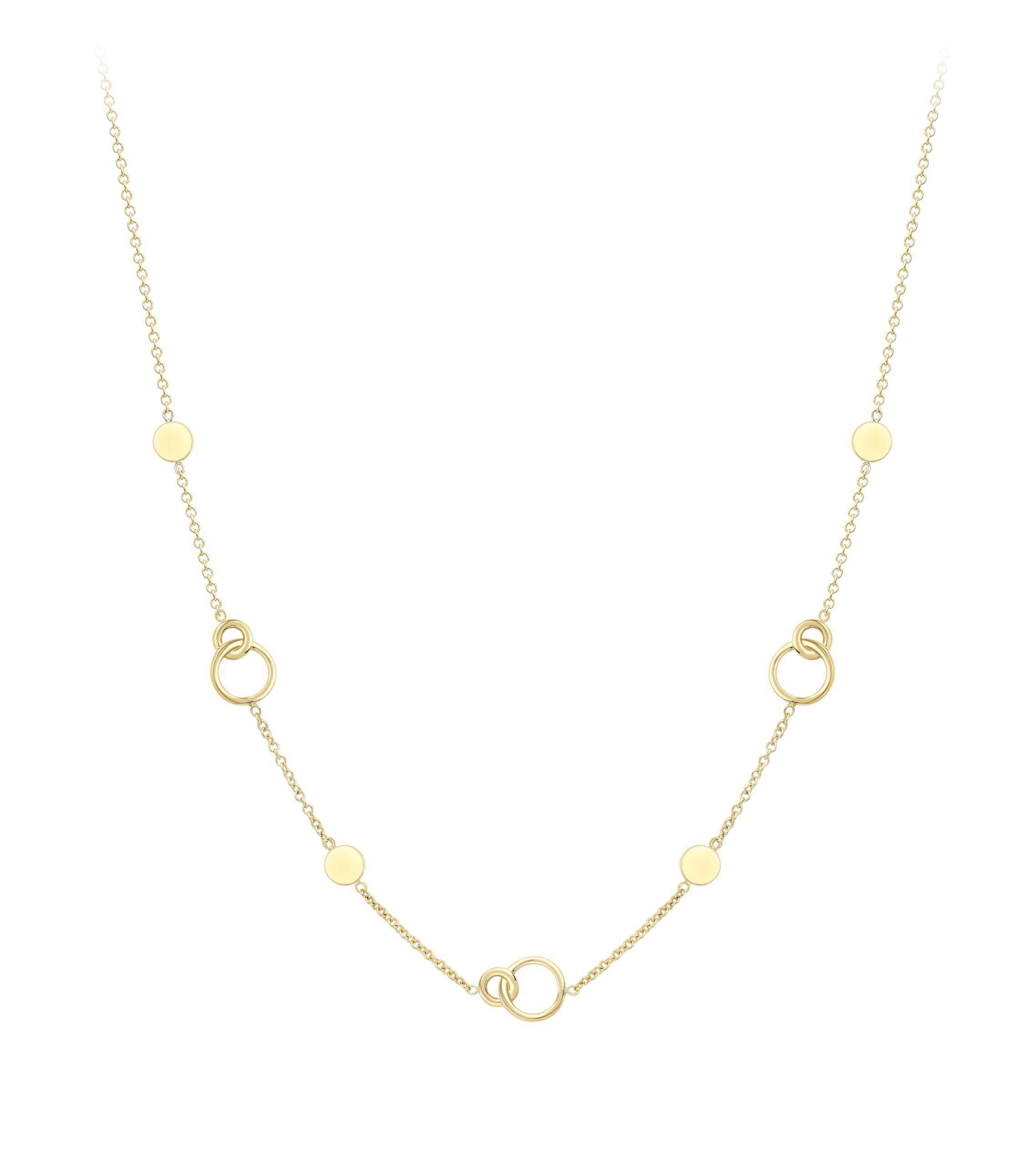 A contemporary 9 carat yellow gold trace link chain necklace inset with polished disc and ring elements.