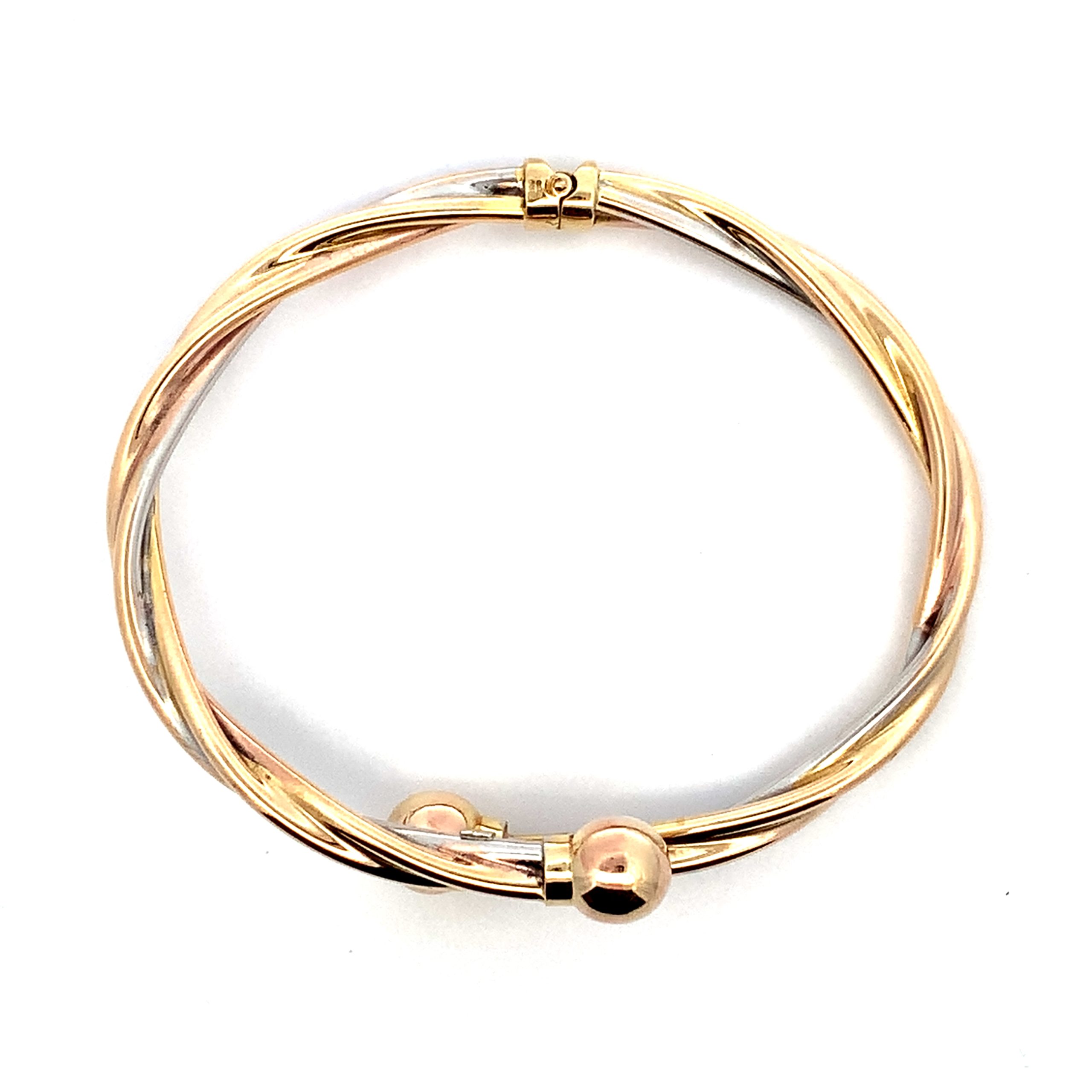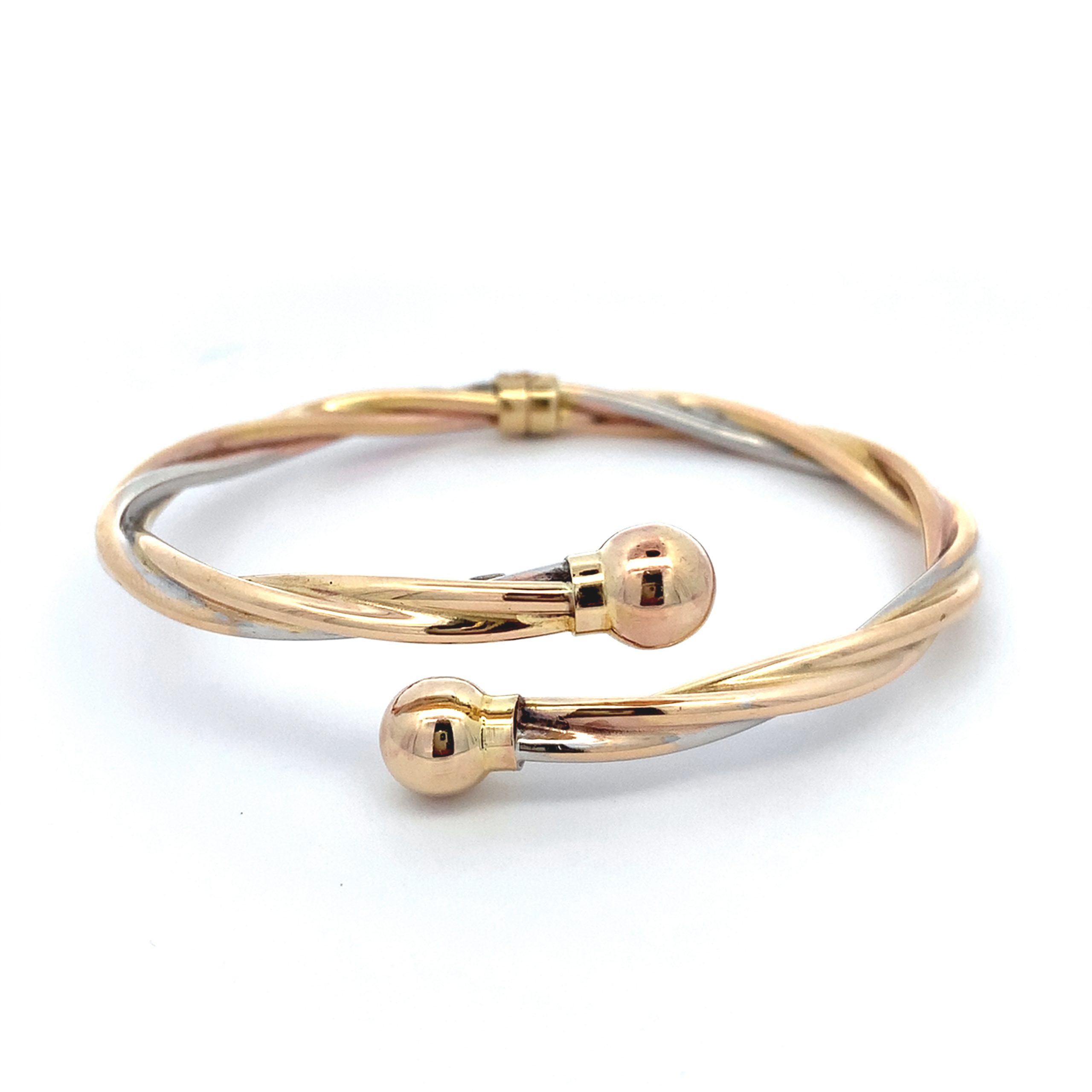 A modern crossover bangle with a sprung hinge and ball ends.