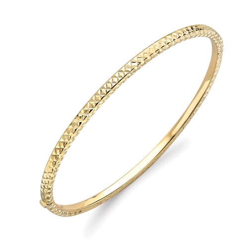 A 9 carat yellow gold ladies dress bangle, with a hinged fitting and a diamond cut pattern to the top and the sides of the bangle.