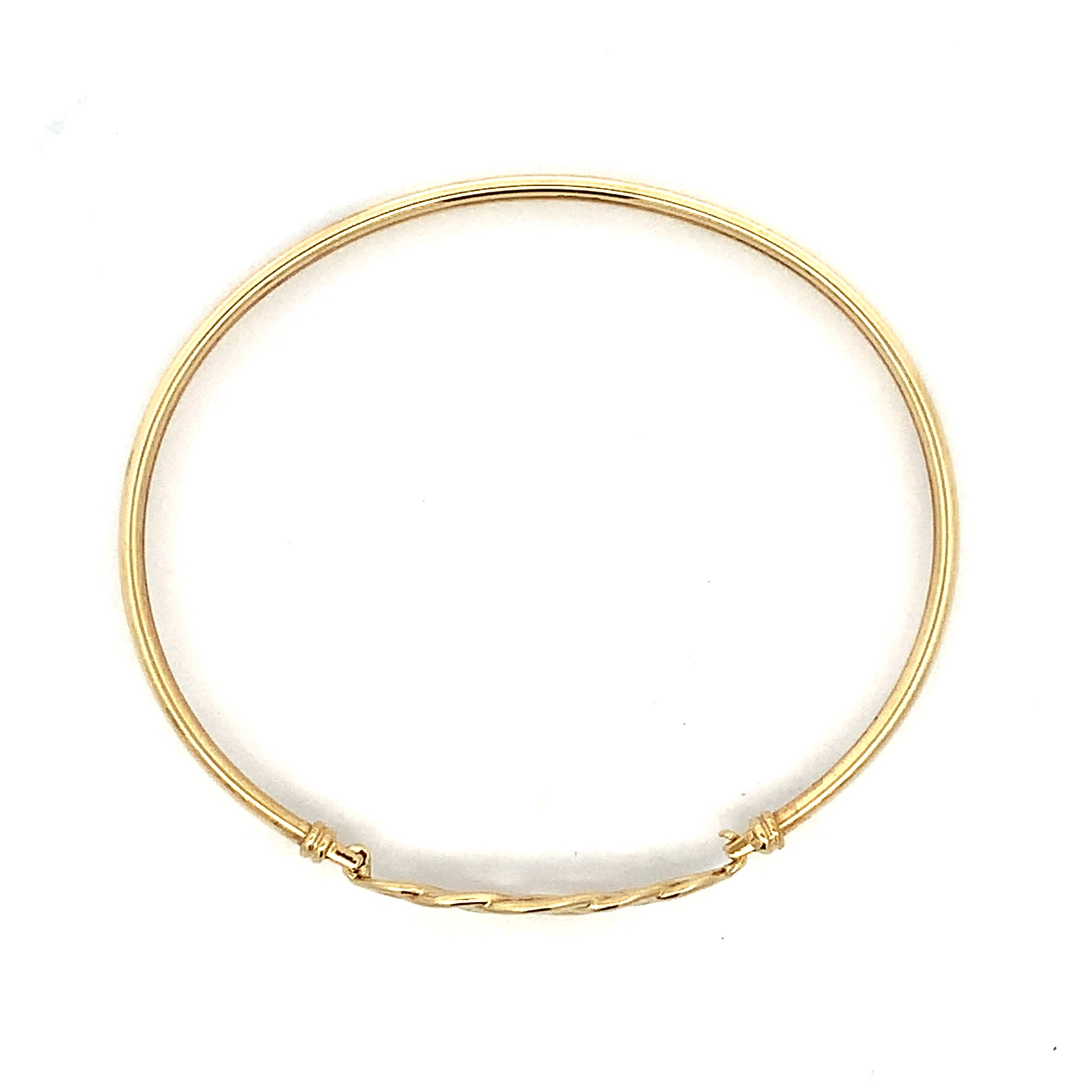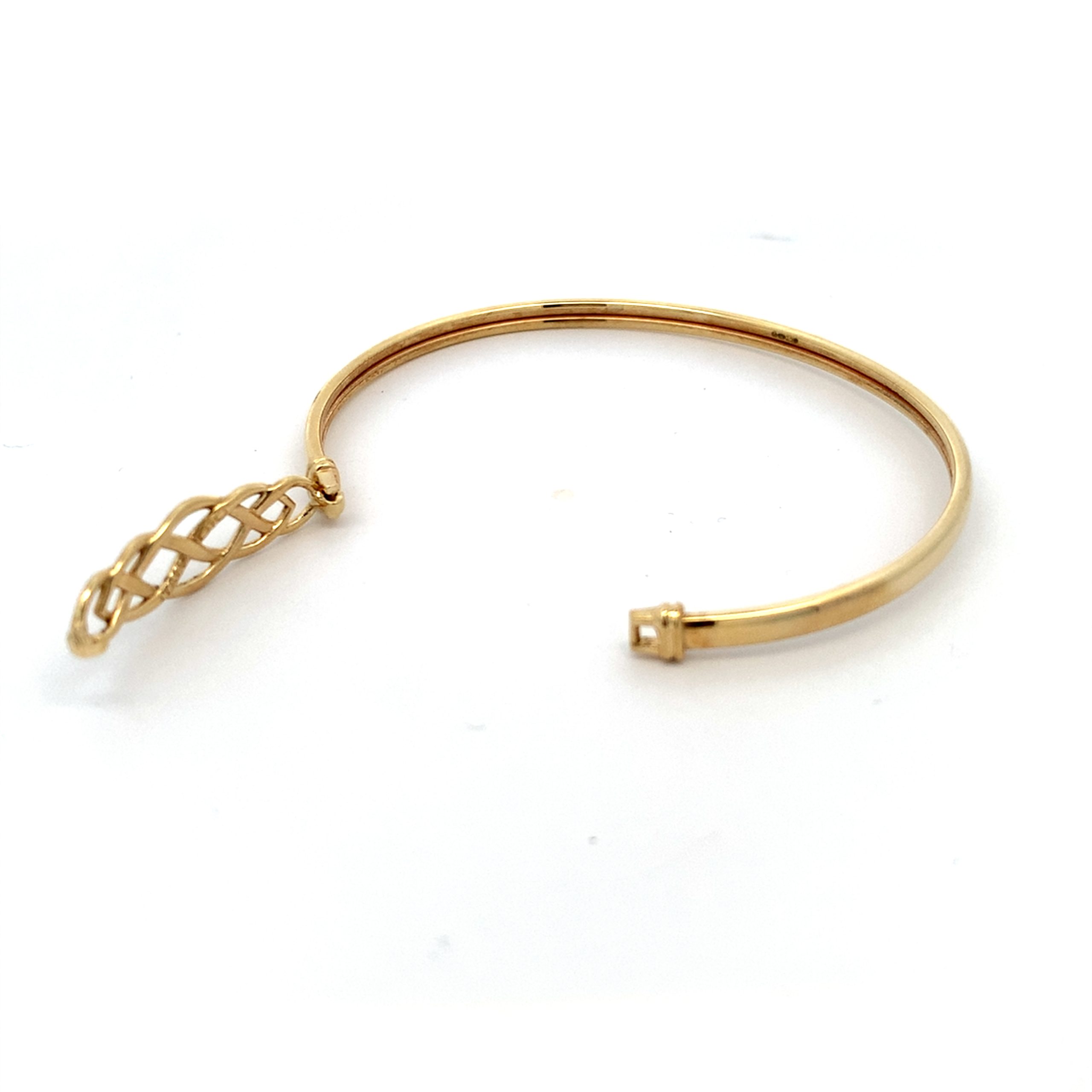 A modern flexi yellow gold oval bangle with a Celtic knot design opening.