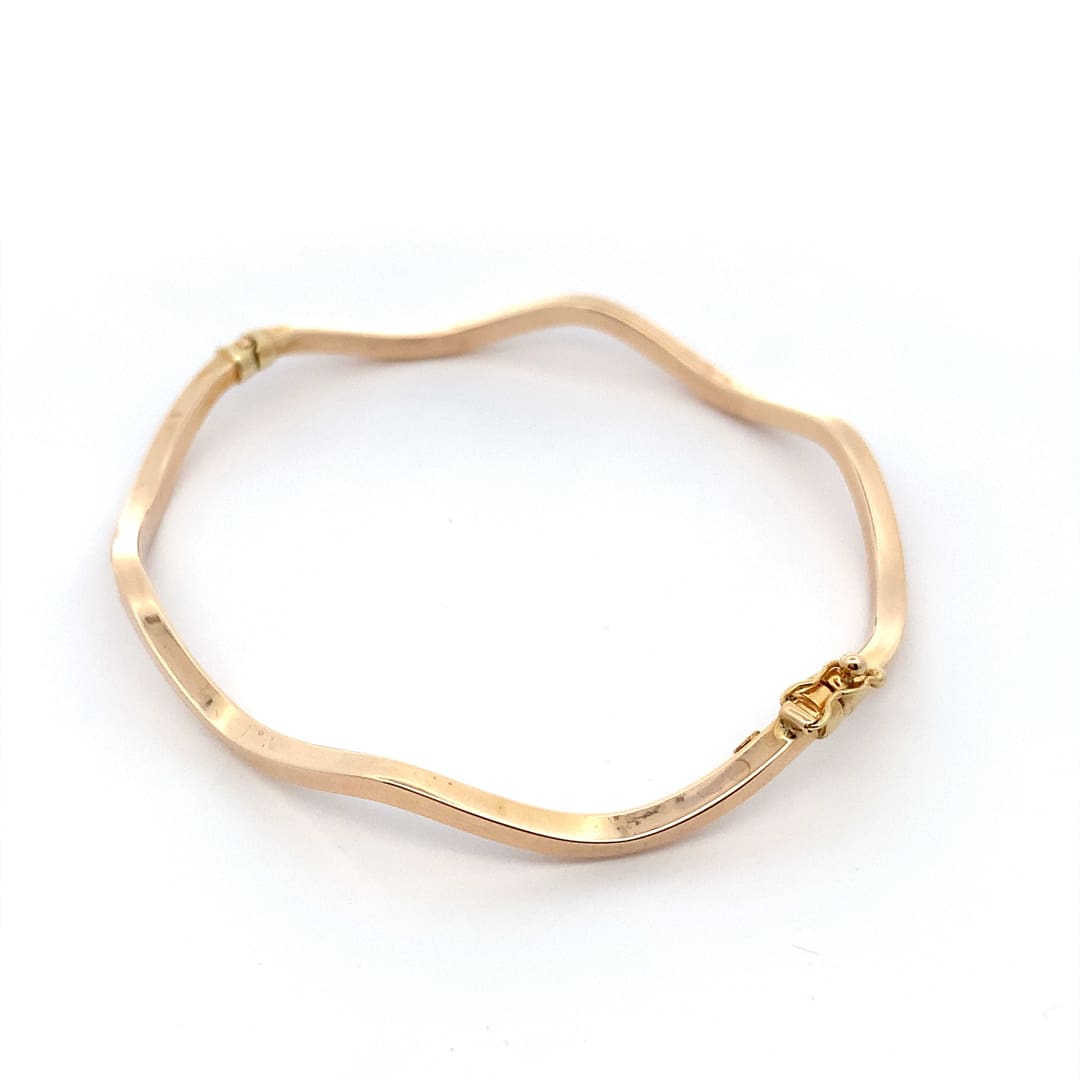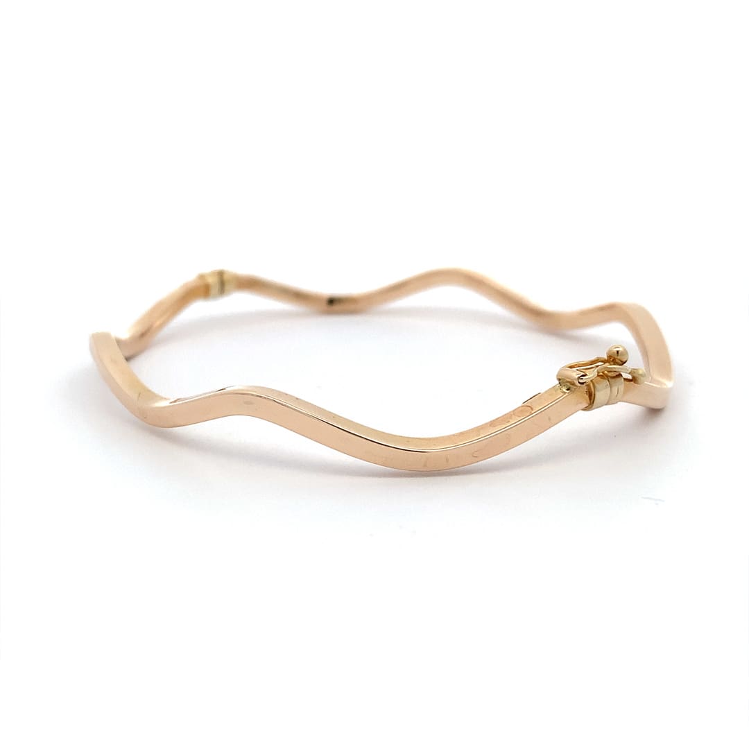 A modern yellow gold bangle in a waved design. This is a sprung-hinge bangle with a safety catch.