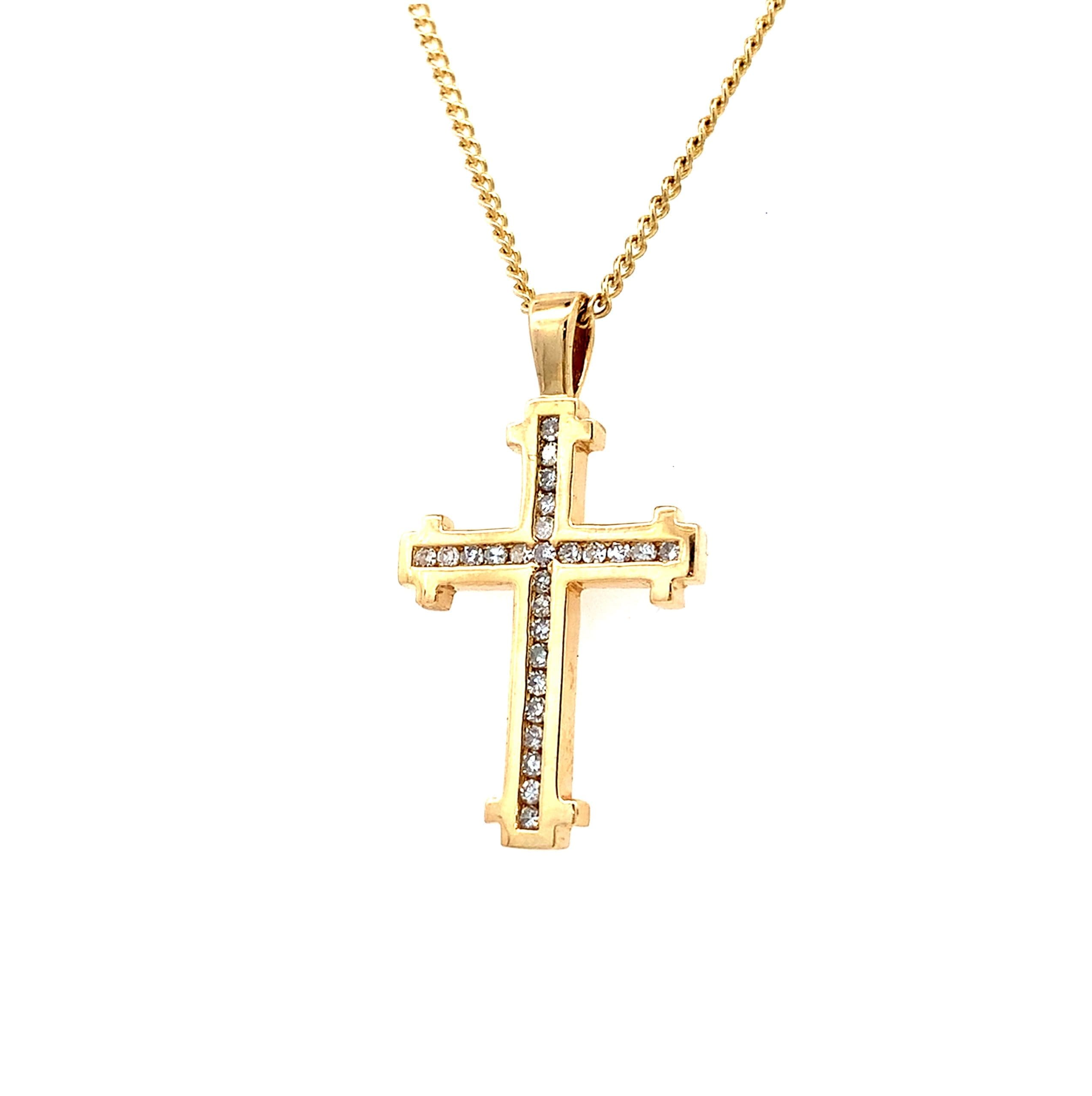 A modern solidly made cross which is channel set with bright round cut diamonds.