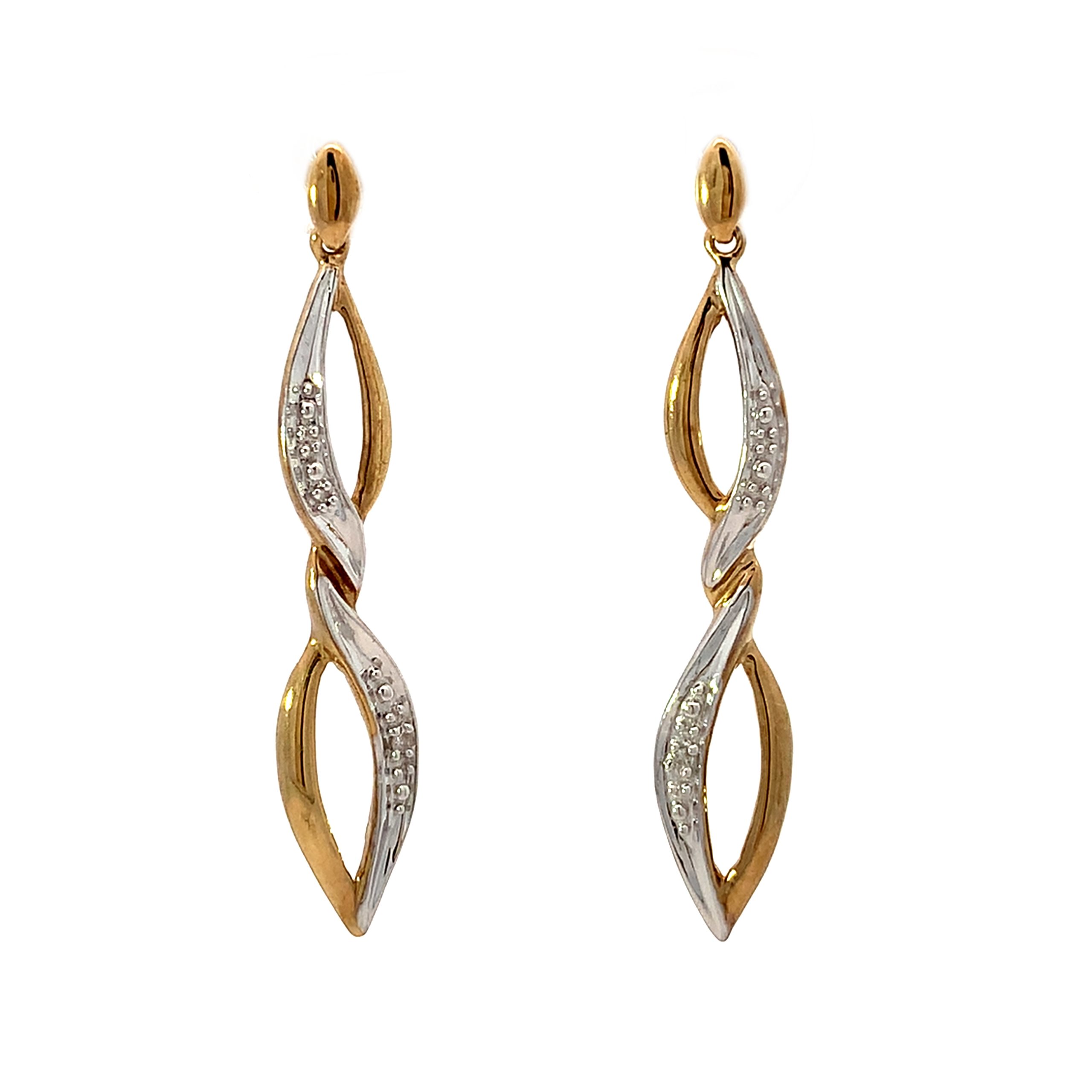 Pretty yellow gold drop earrings each set with a single small diamond in illusion settings. With post and scroll back fittings.