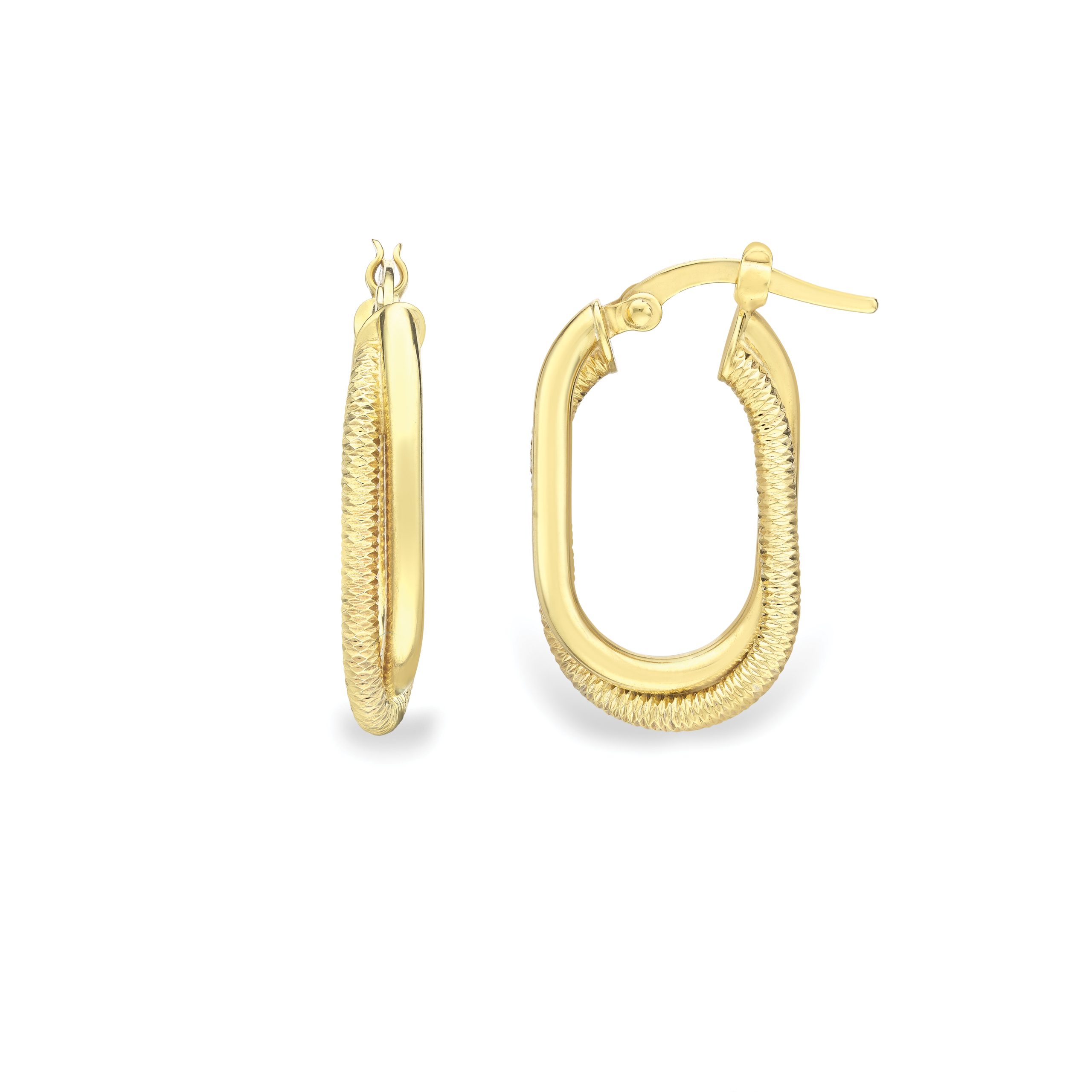 Smooth and textured crossed hoop earrings with a hinged post.