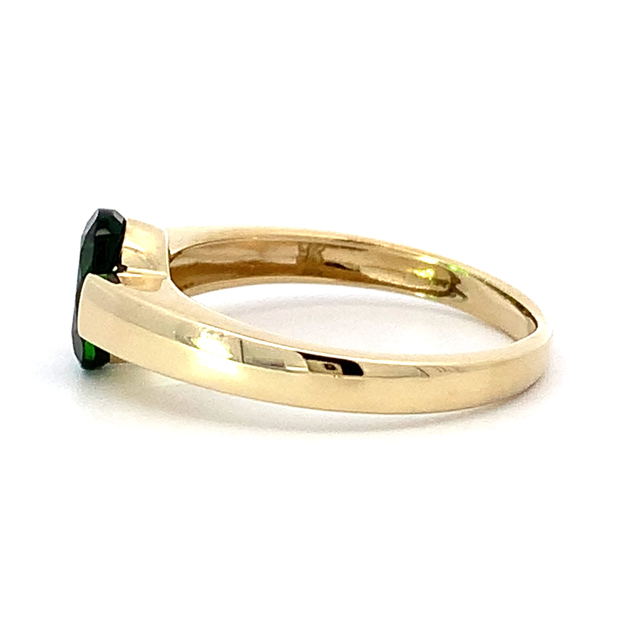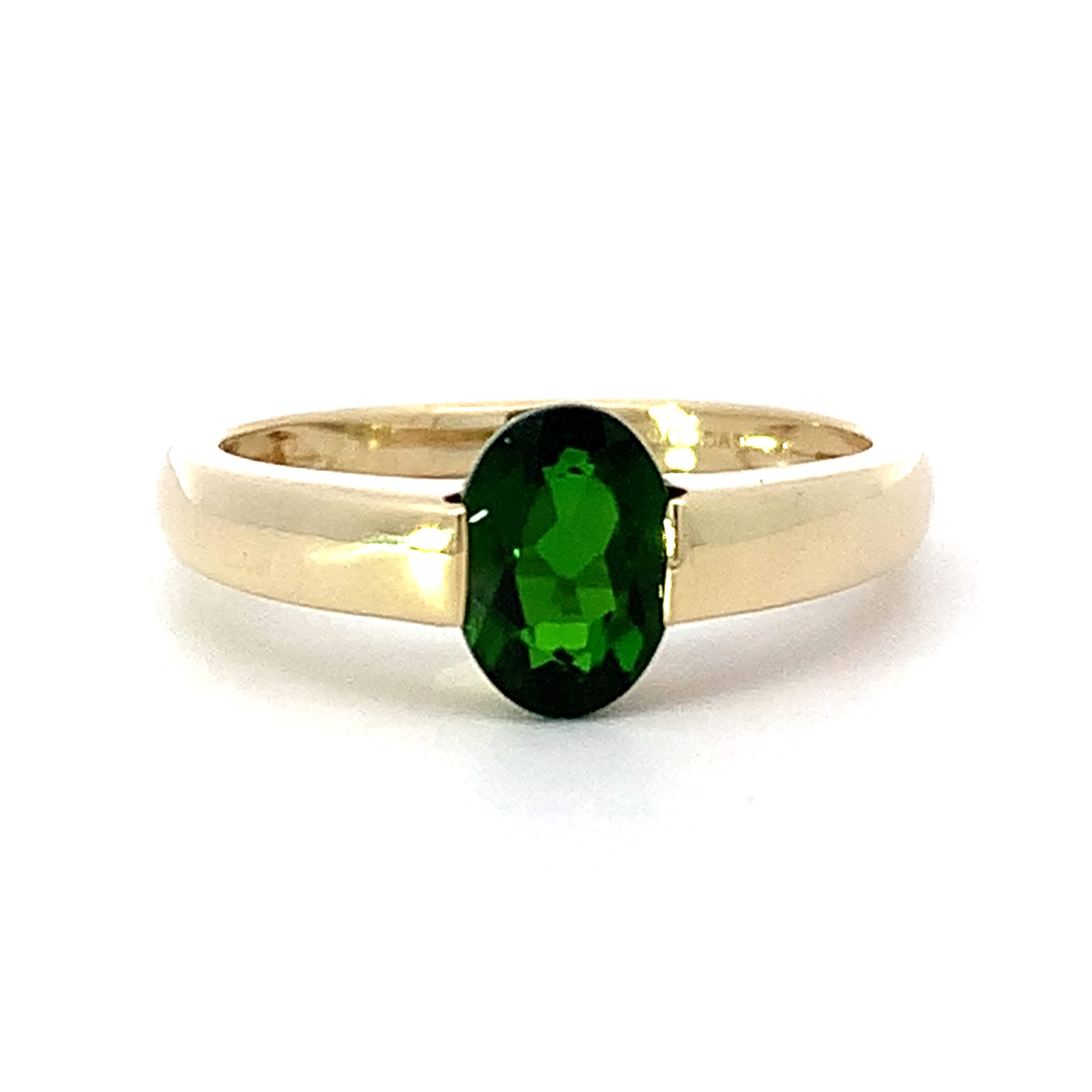 A smooth modern dress ring rub-over set with oval cut green garnet.