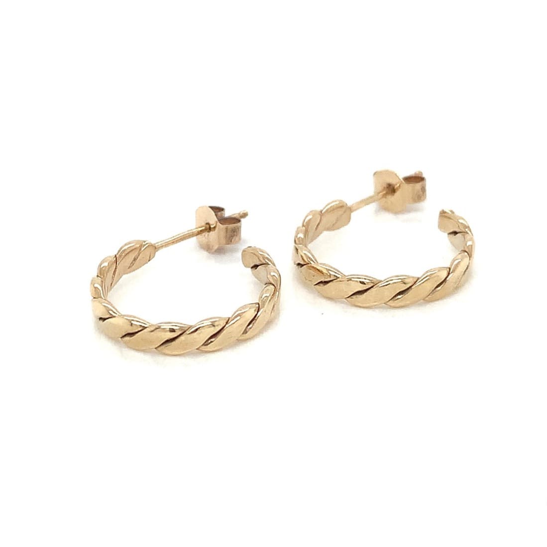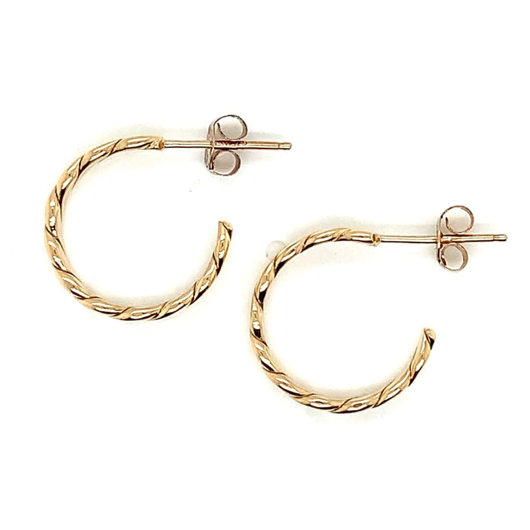 Simple three-quarter hoop earrings with twisted detail. With posts and scroll earring backs.