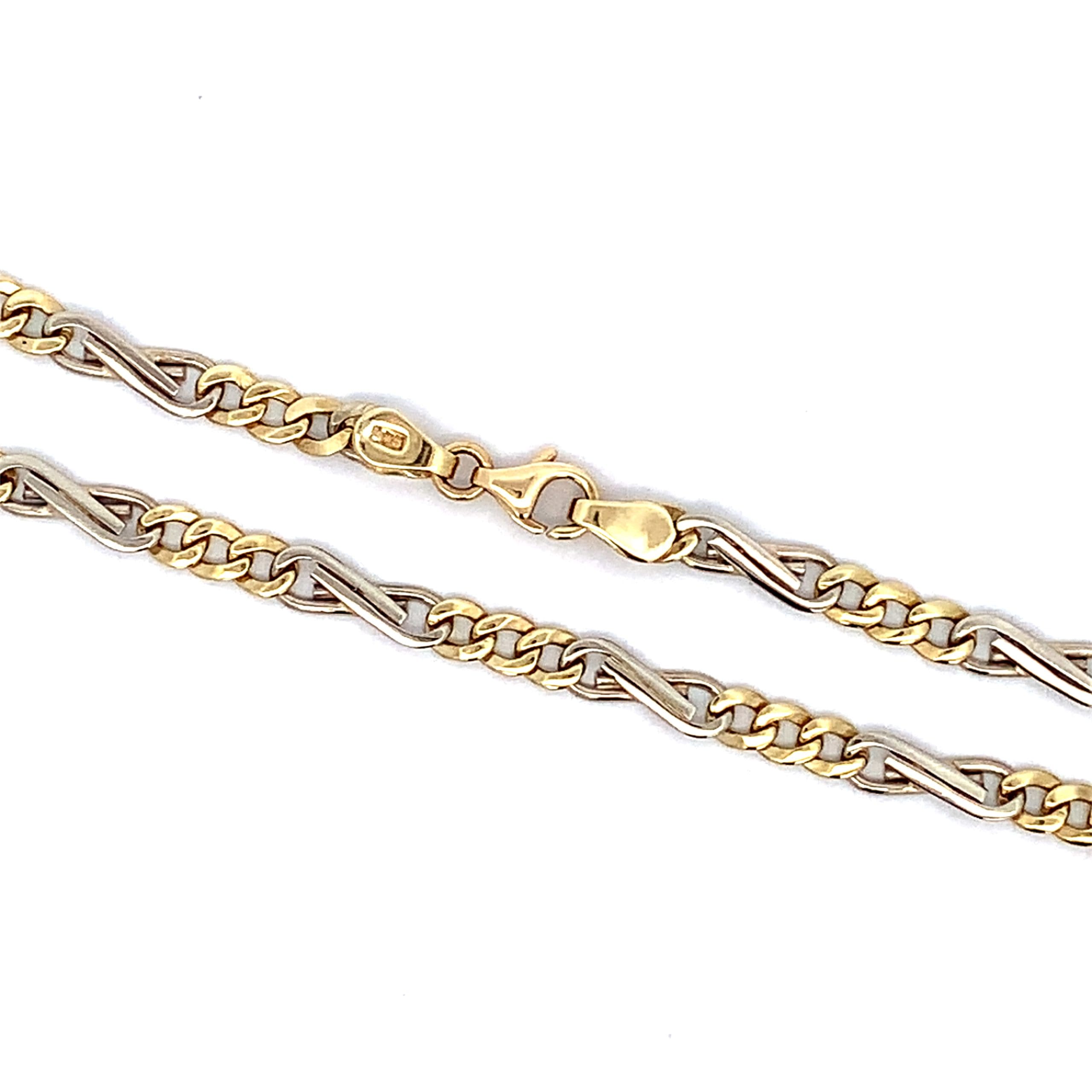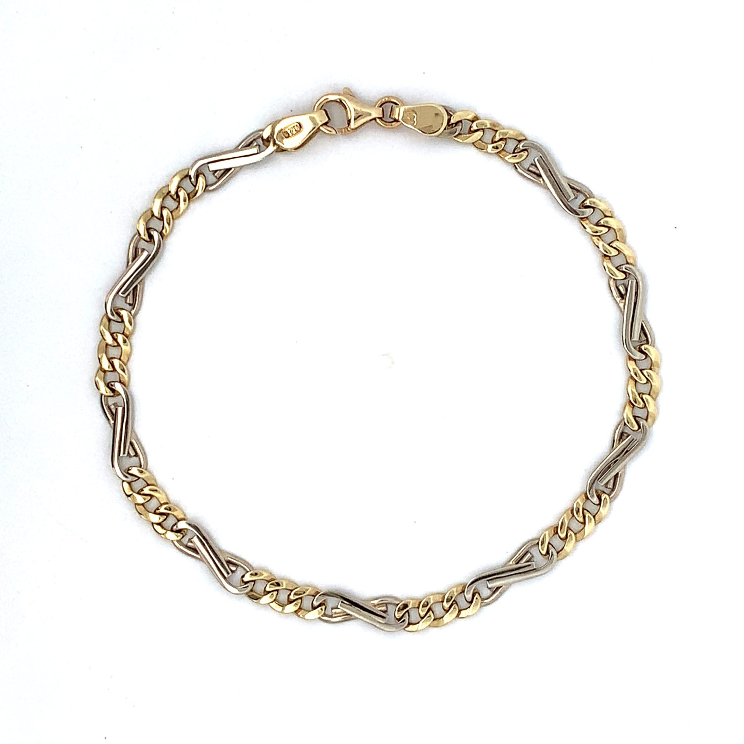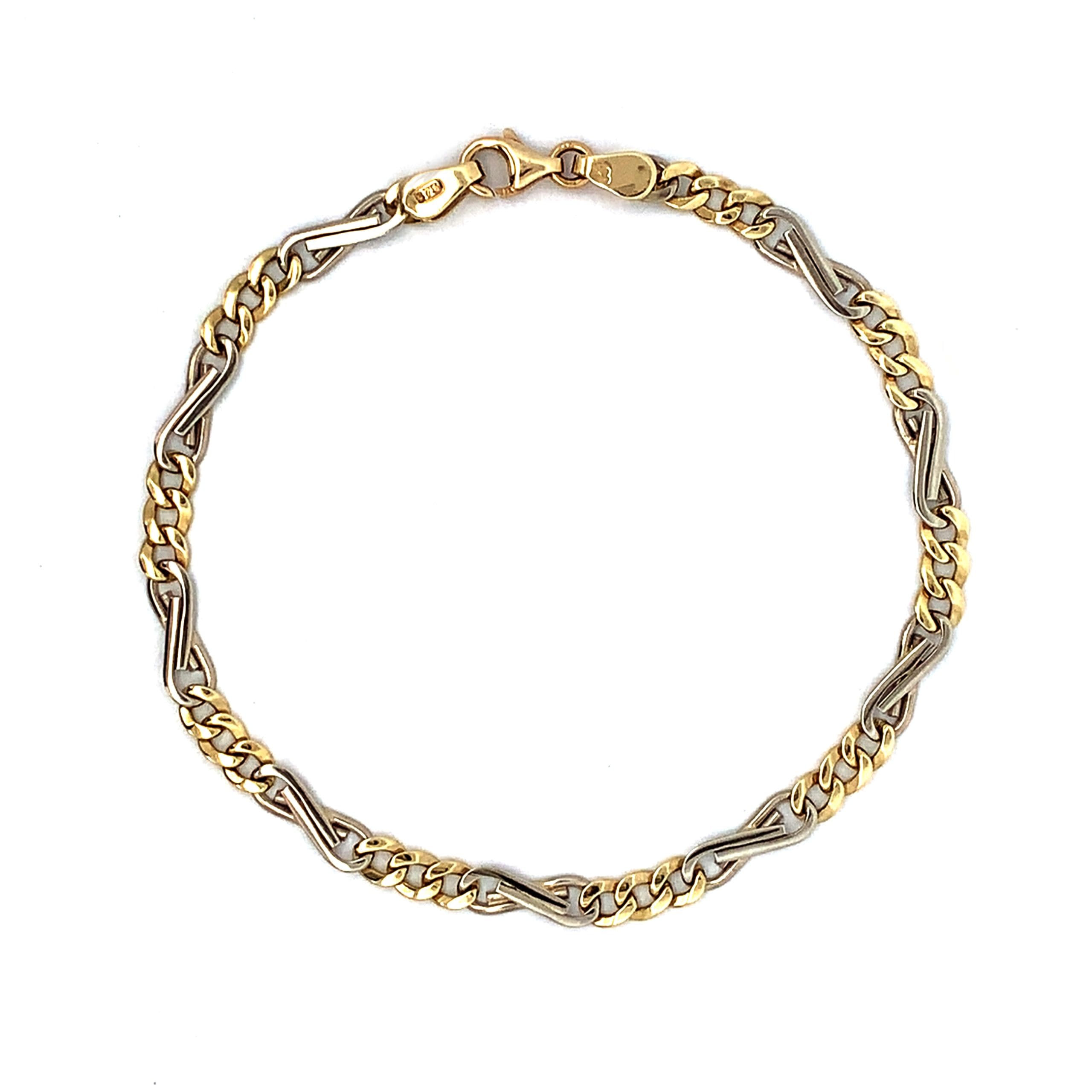 A strong flat curb link bracelet in yellow gold inset with white gold infinity links.