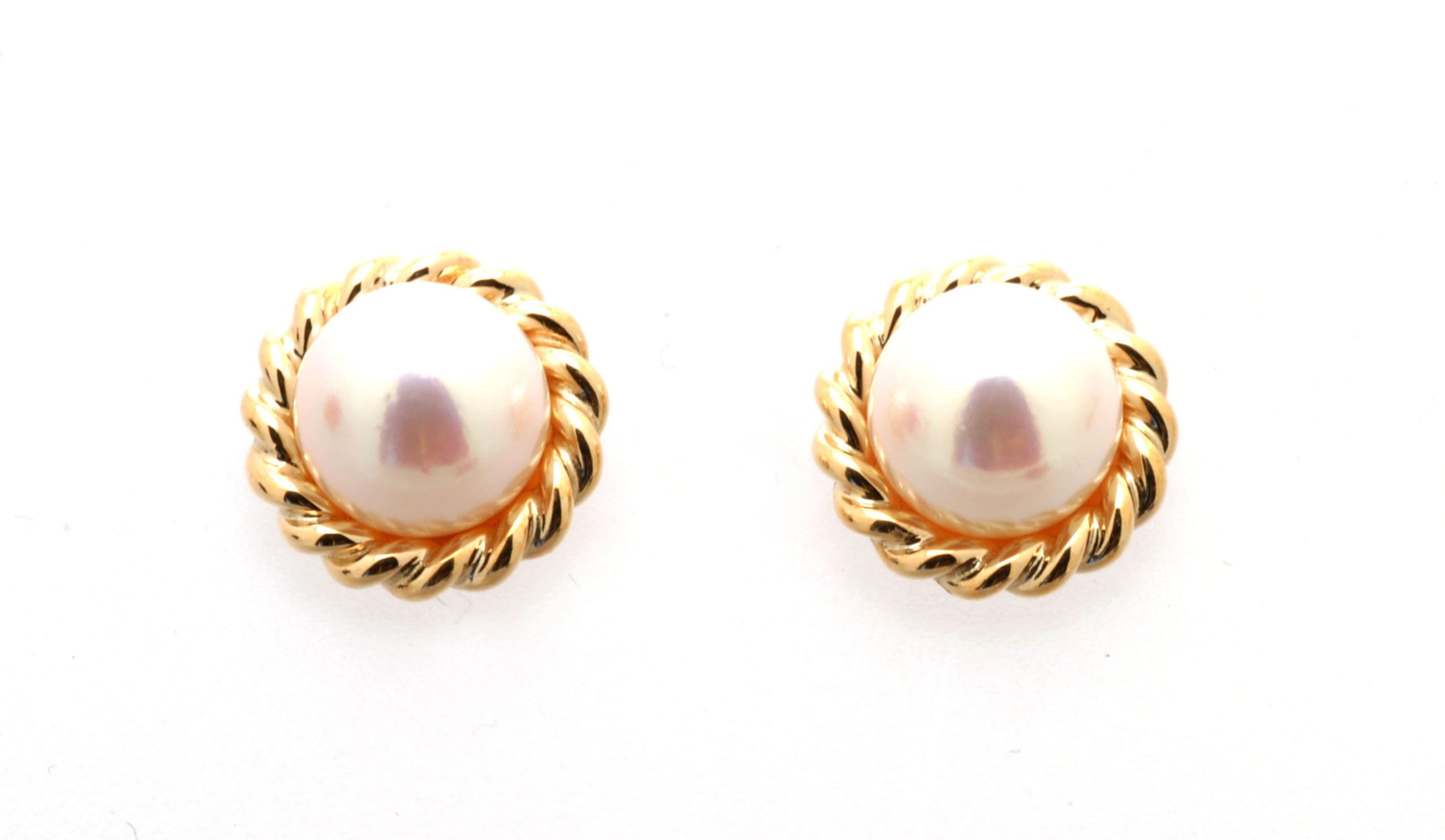 A pair of pearl stud earrings with post and butterfly fittings framed in a twisted 9 carat gold surround.