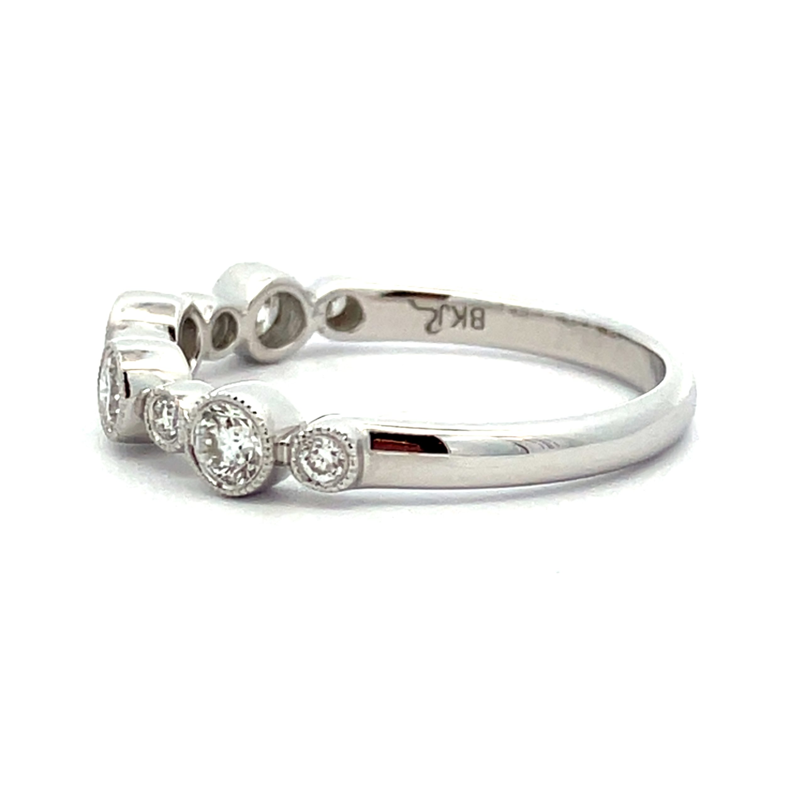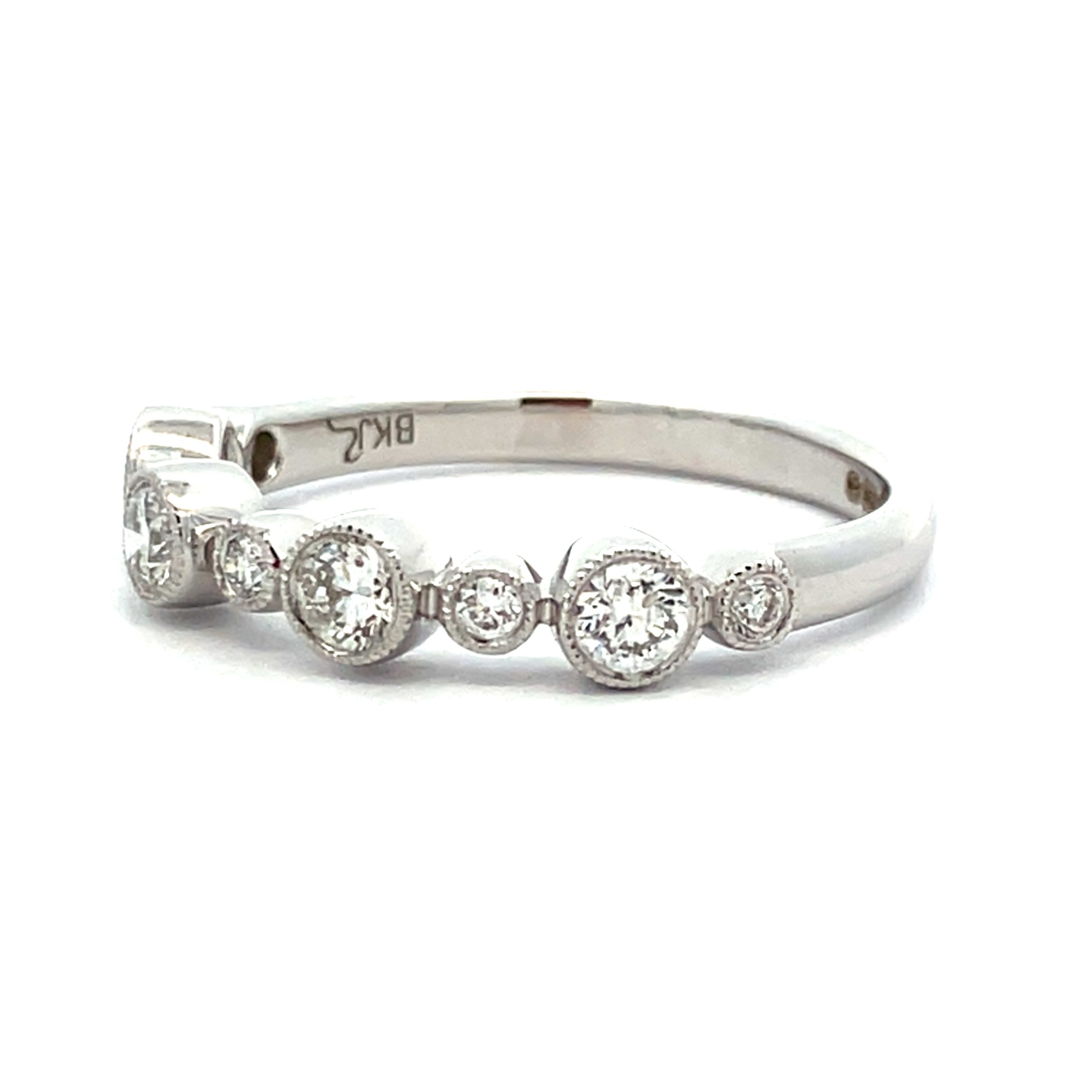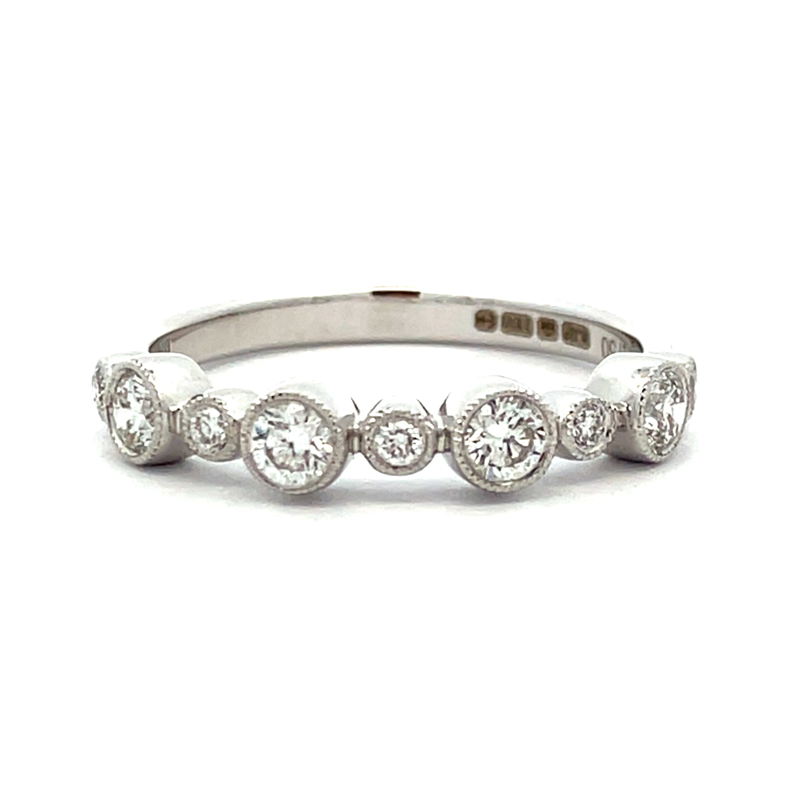 A delightful row of round brilliant cut diamond with good colour and clarity – all set within milgrain rub-over settings on a strong ring shank.