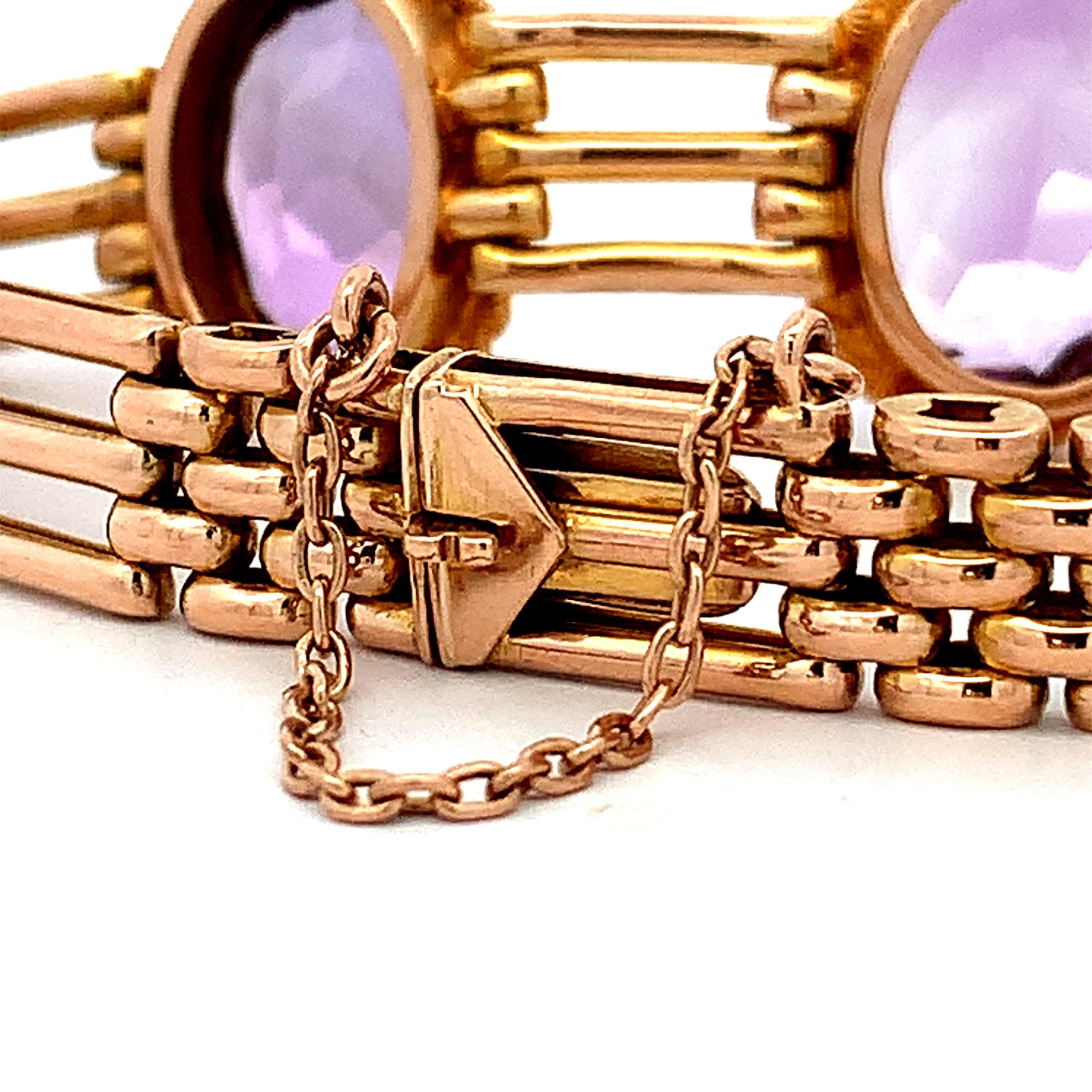 A stunning yellow gold gate bracelet with three large faceted amethyst ovals in twist work settings. The clasp is a secure hidden box clasp with safety chain.