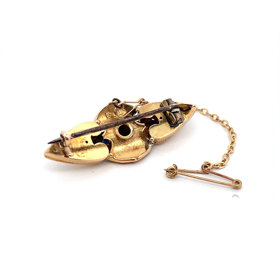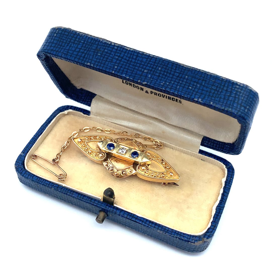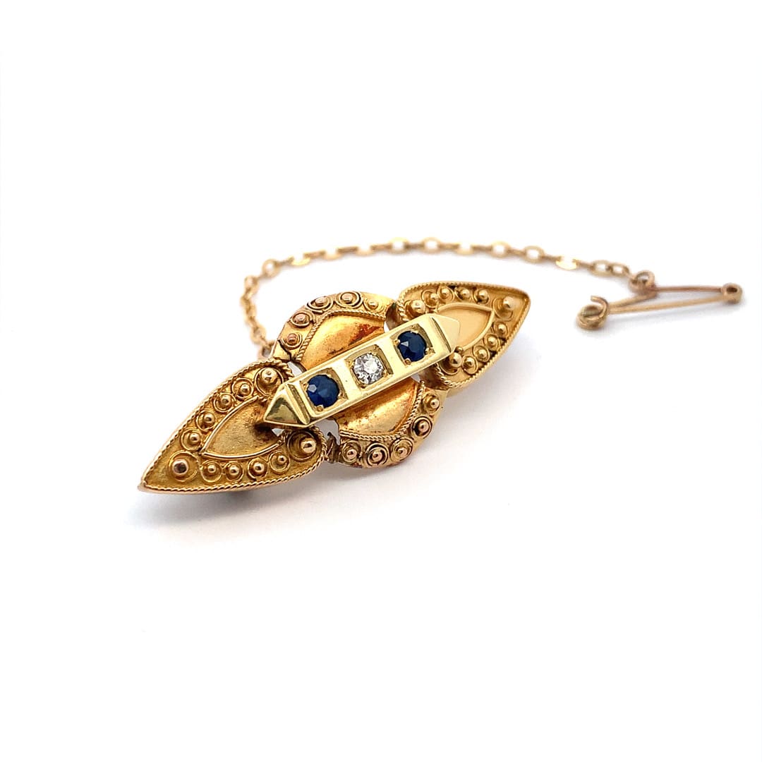 A Victorian 15ct gold brooch set with round cut sapphire and diamond.