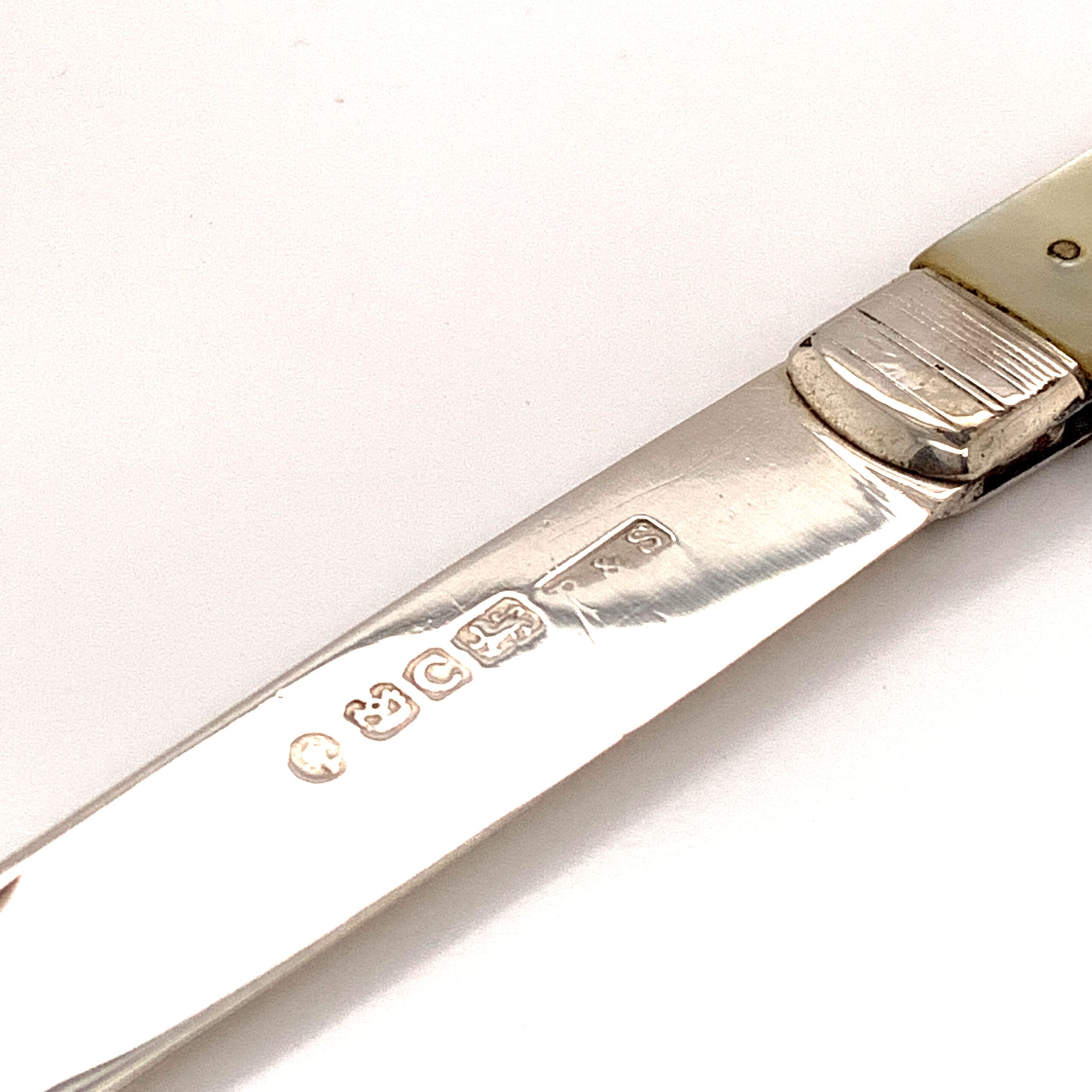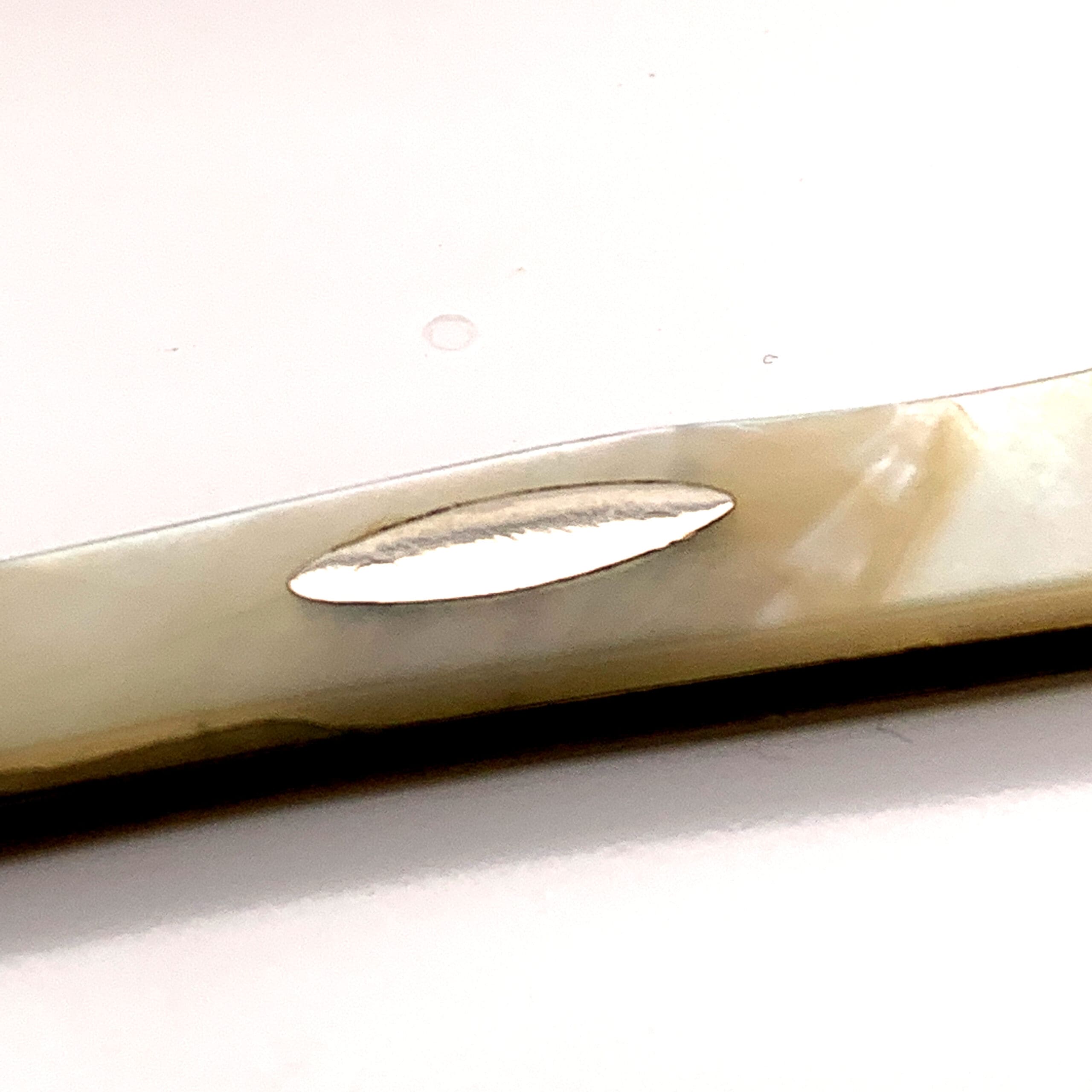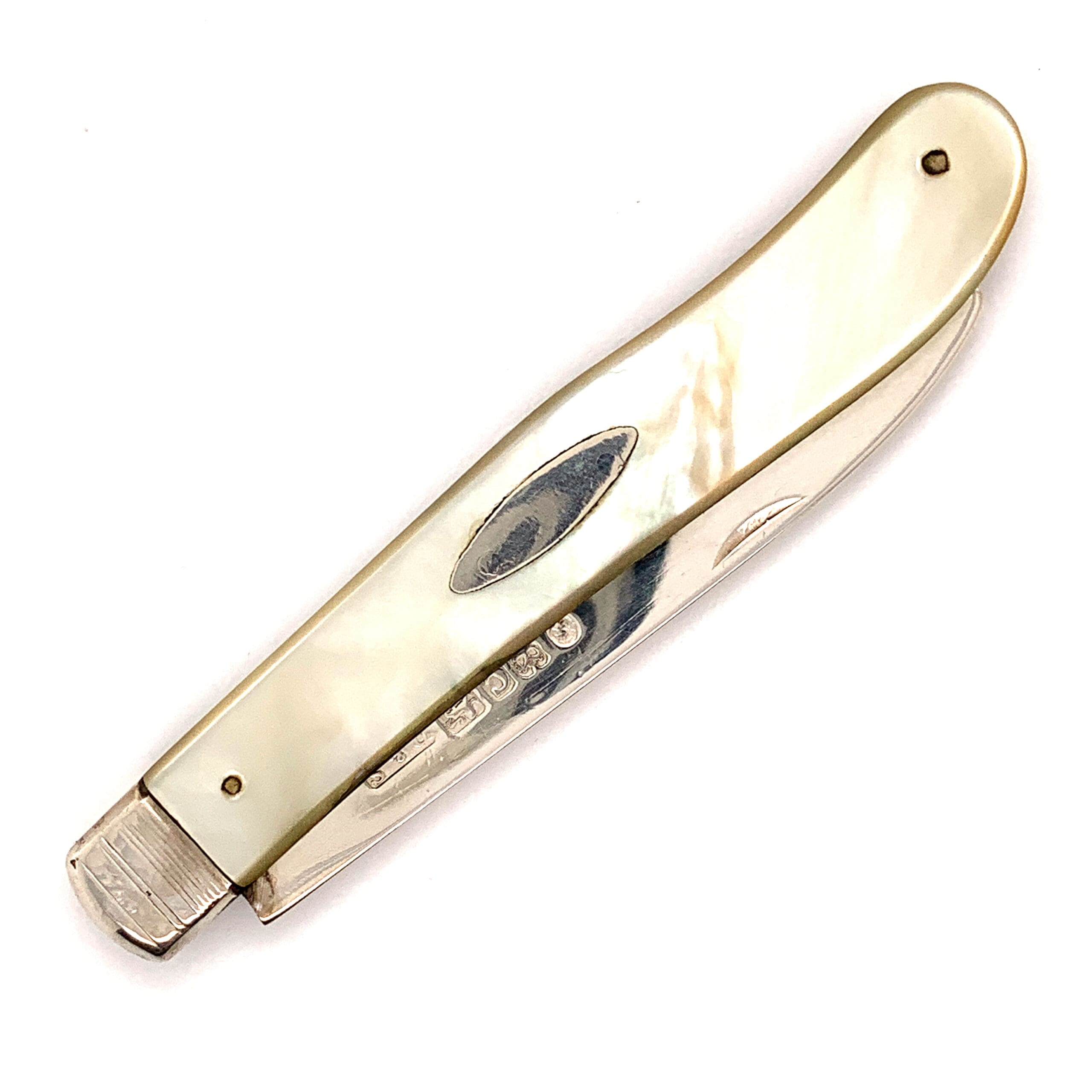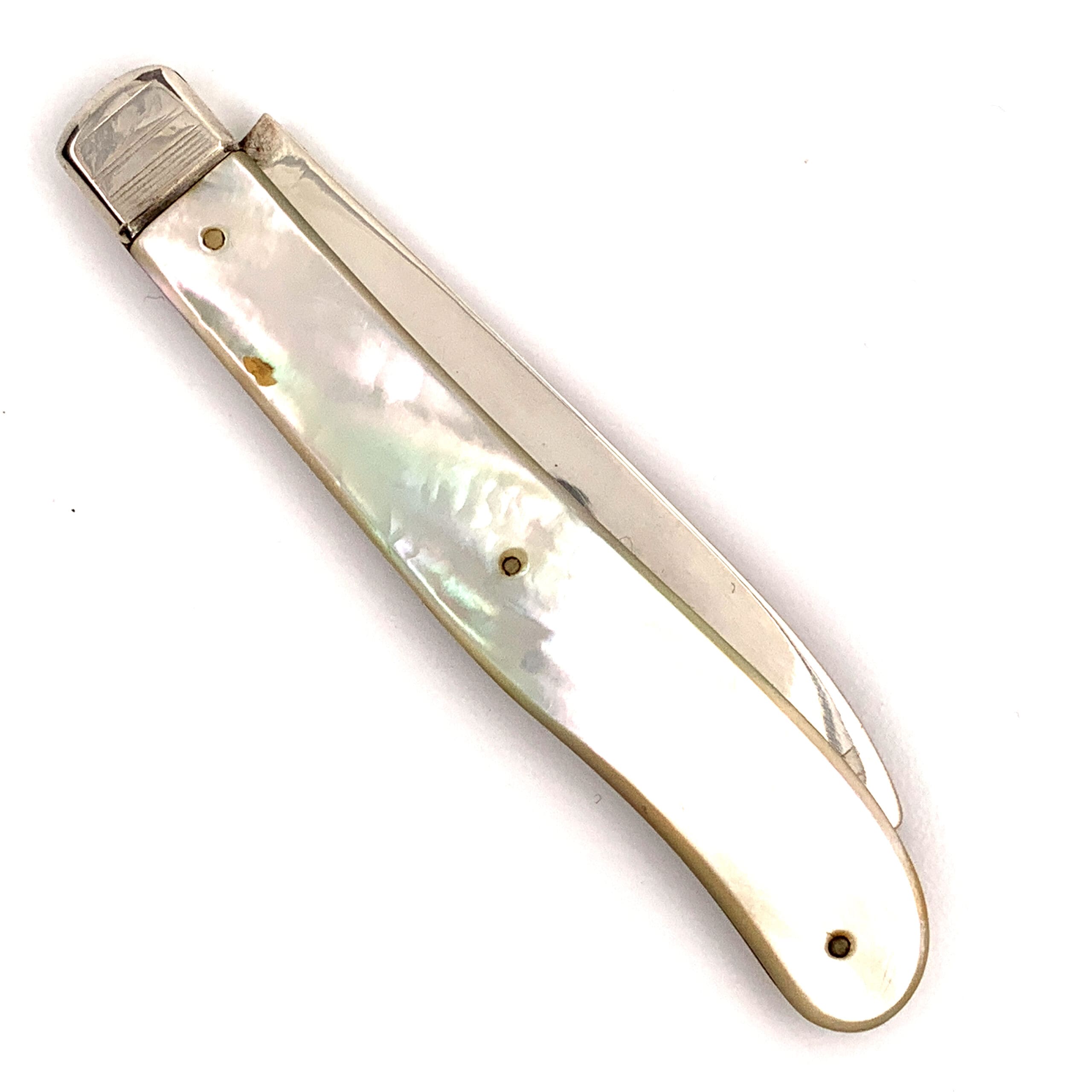 A lovely antique folding knife in silver with Mother of Pearl casing. The maker’s mark is Roberts and Slater ( Samuel Roberts and Joseph Slater ).